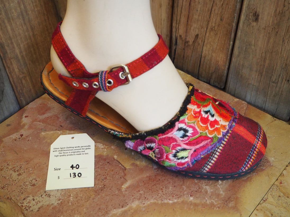 The unique hand-embroidered fabric covering the toe is recycled from the neck pieces of antique Mayan blouses, which are the most exquisitely embroidered part of the work, often depicting flowers and birds from the area where the blouse originates. The circular nature of the neck-piece provides a perfect shape for the Ballerina sandal, enclosing the upper foot and leaving the rest of the foot free.