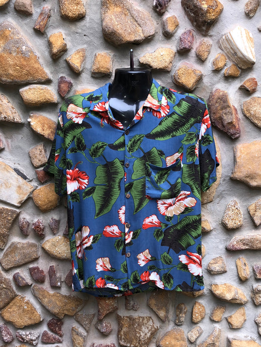 Small Love Shirt - Hibiscus and Green Leaves on Blue