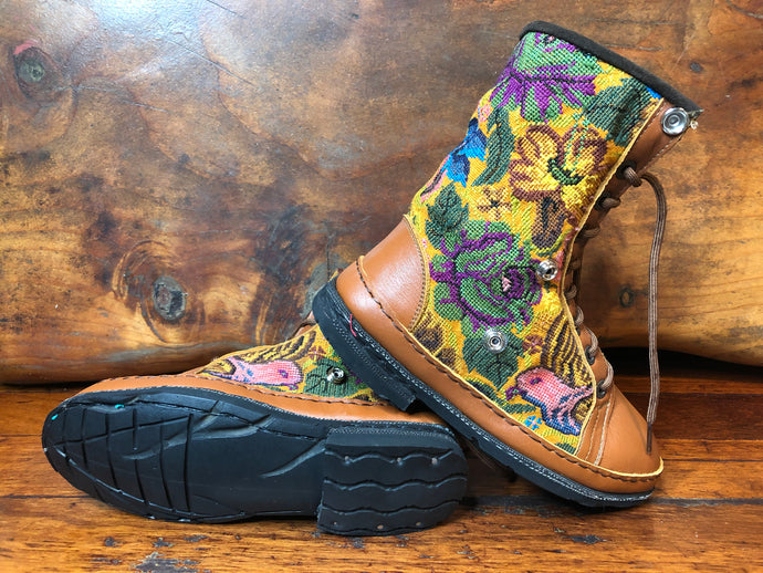 These antique cloth and leather boots can be worn at three different heights; ankle boots, hiker boots and high top boots, with sturdy press-studs to fasten at each height.