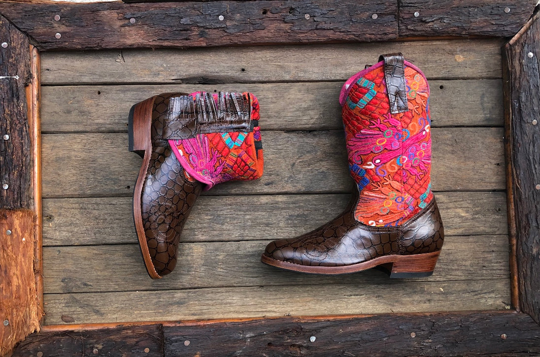 These "two-in-one" boots can be worn as Cowgirl Boots or rolled down as Ankle Boots. Handmade by an Indigenous Guatemalan family of shoe-makers with three generations of experience, these boots have compressed leather soles which can be resoled and can last up to 30 years if cared for well.