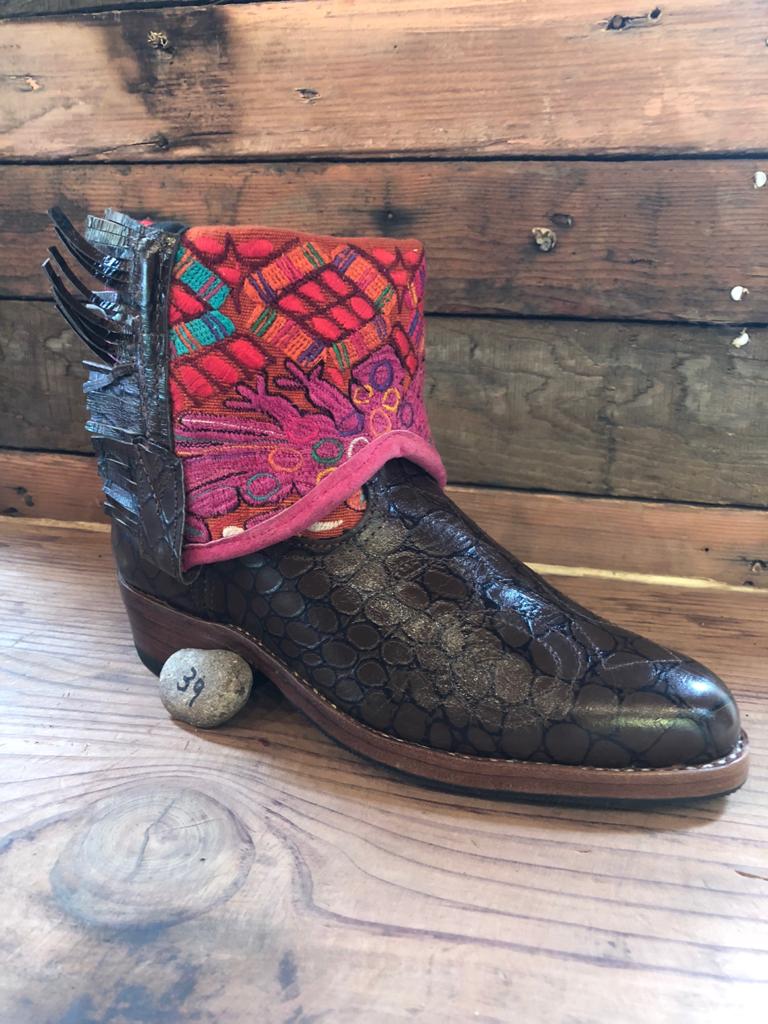 Antique hand-embroidered blouses with Mayan symbology are recycled to create a "one of a kind" boot with a unique combination of external and internal fabric, an internal zip for easy fitting and quality natural leather upper and tassels.