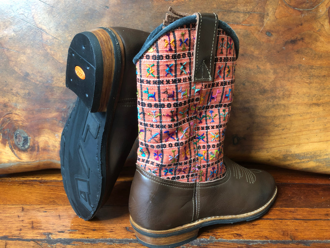 These "two-in-one" boots can be worn as Cowgirl Boots or rolled down as Ankle Boots. Handmade by an Indigenous Guatemalan family of shoe-makers with three generations of experience, these boots have compressed leather soles which can be resoled and can last up to 30 years if cared for well.