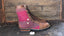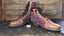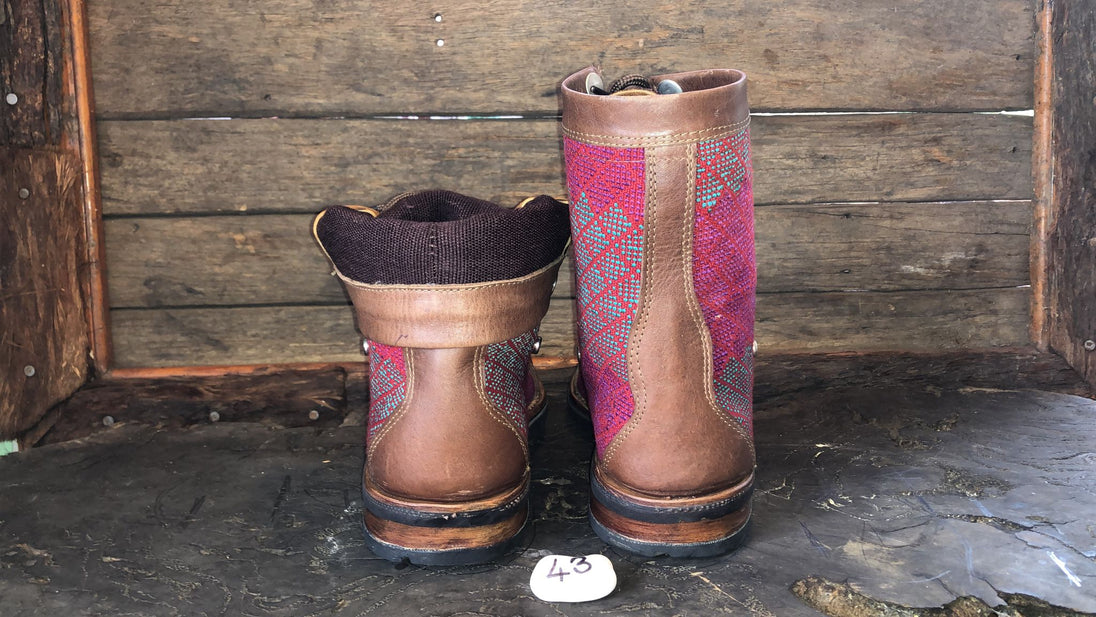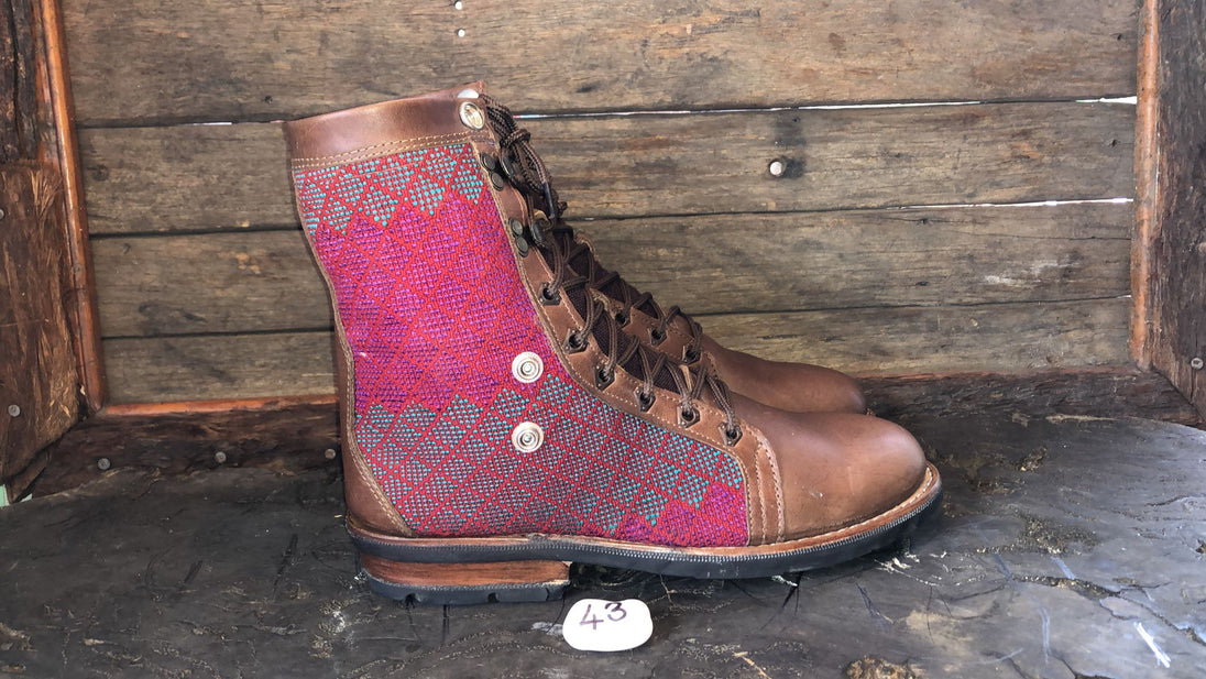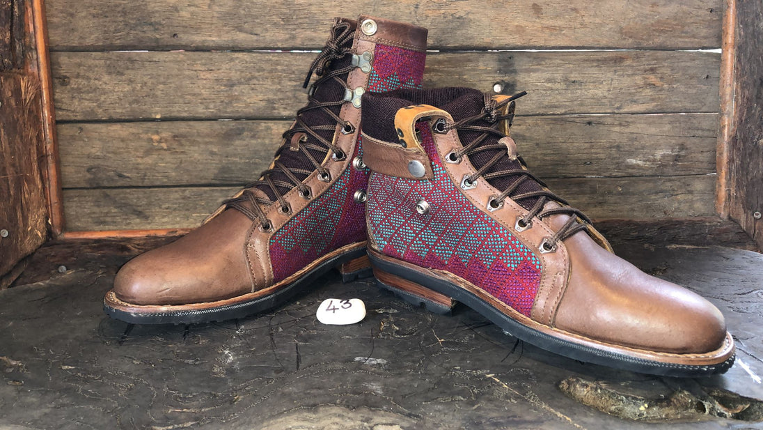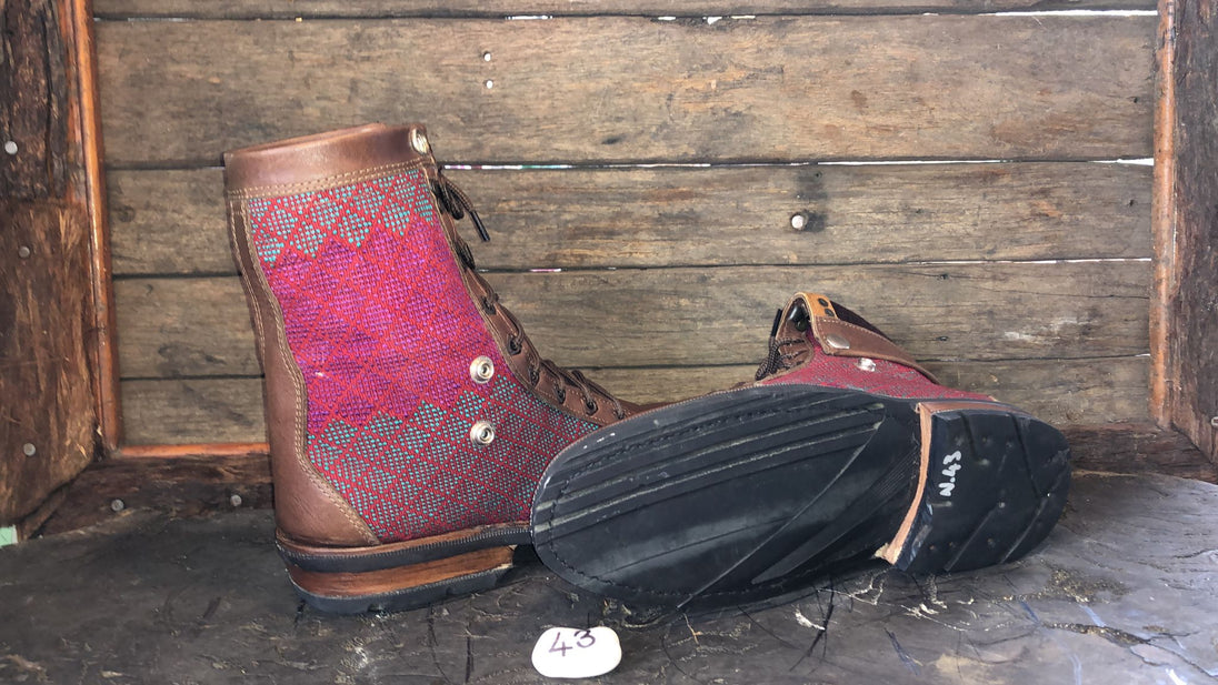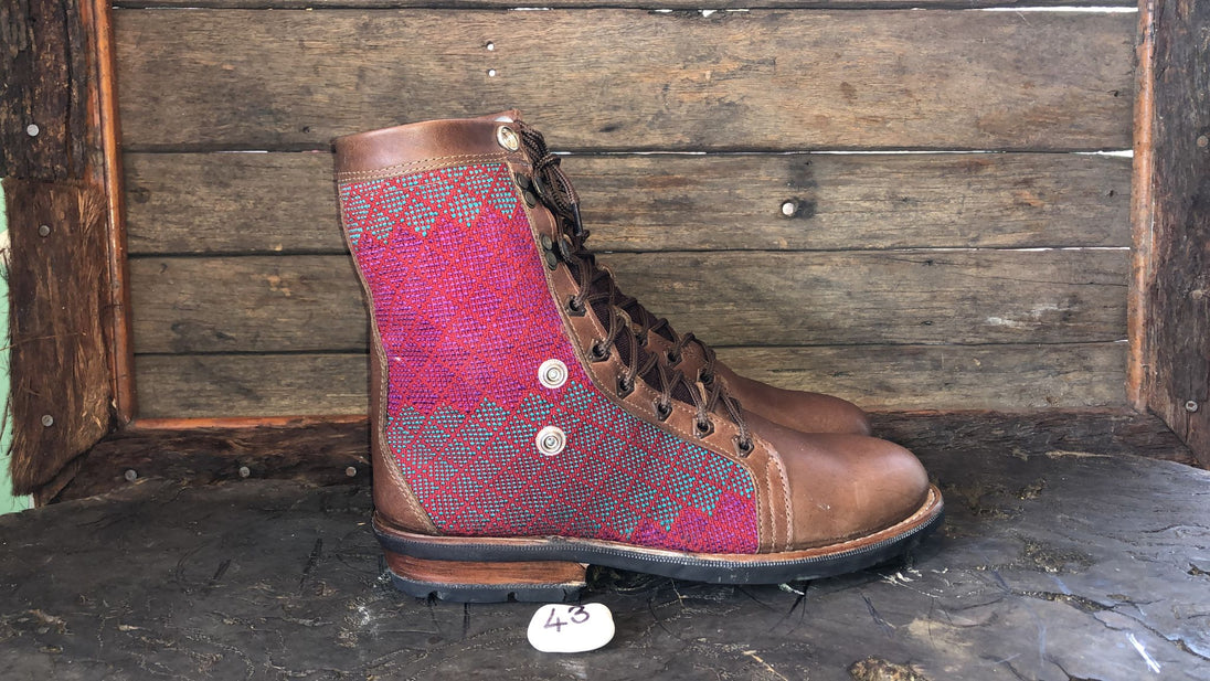 Antique hand-embroidered blouses with Mayan symbology are recycled to create a one-of-a-kind boot with a unique combination of external embroidered fabric and a thick, hand-woven cotton tongue.