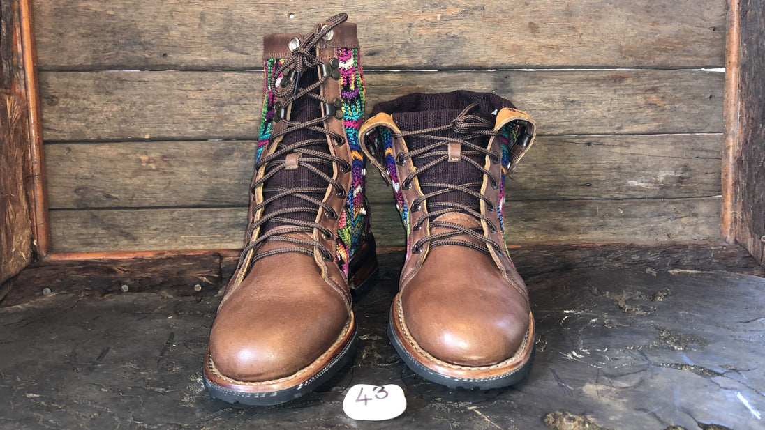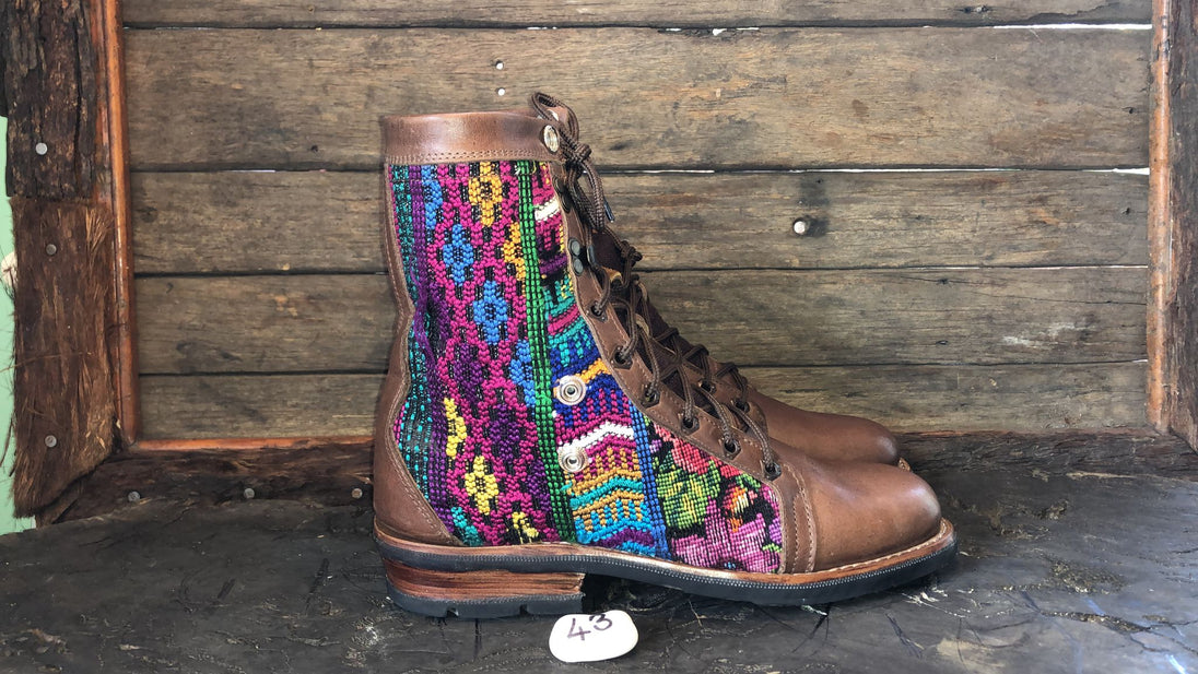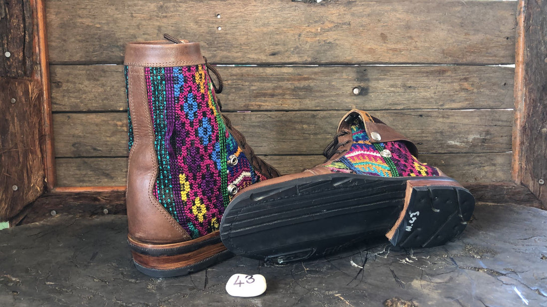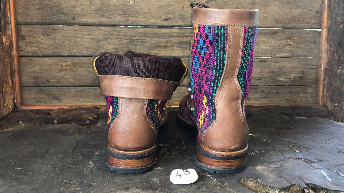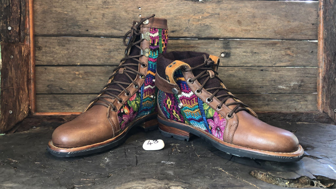 Antique hand-embroidered blouses with Mayan symbology are recycled to create a one-of-a-kind boot with a unique combination of external embroidered fabric and a thick, hand-woven cotton tongue.