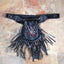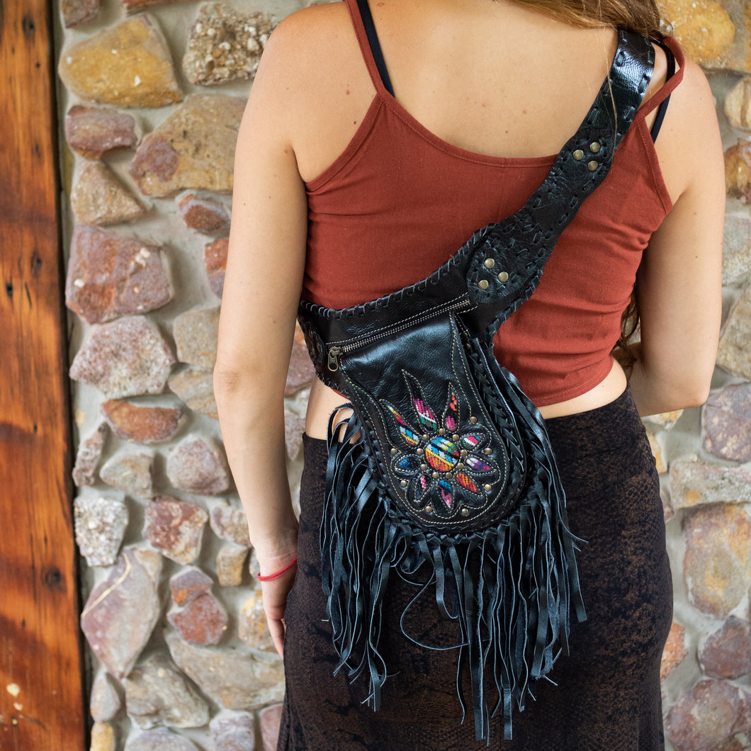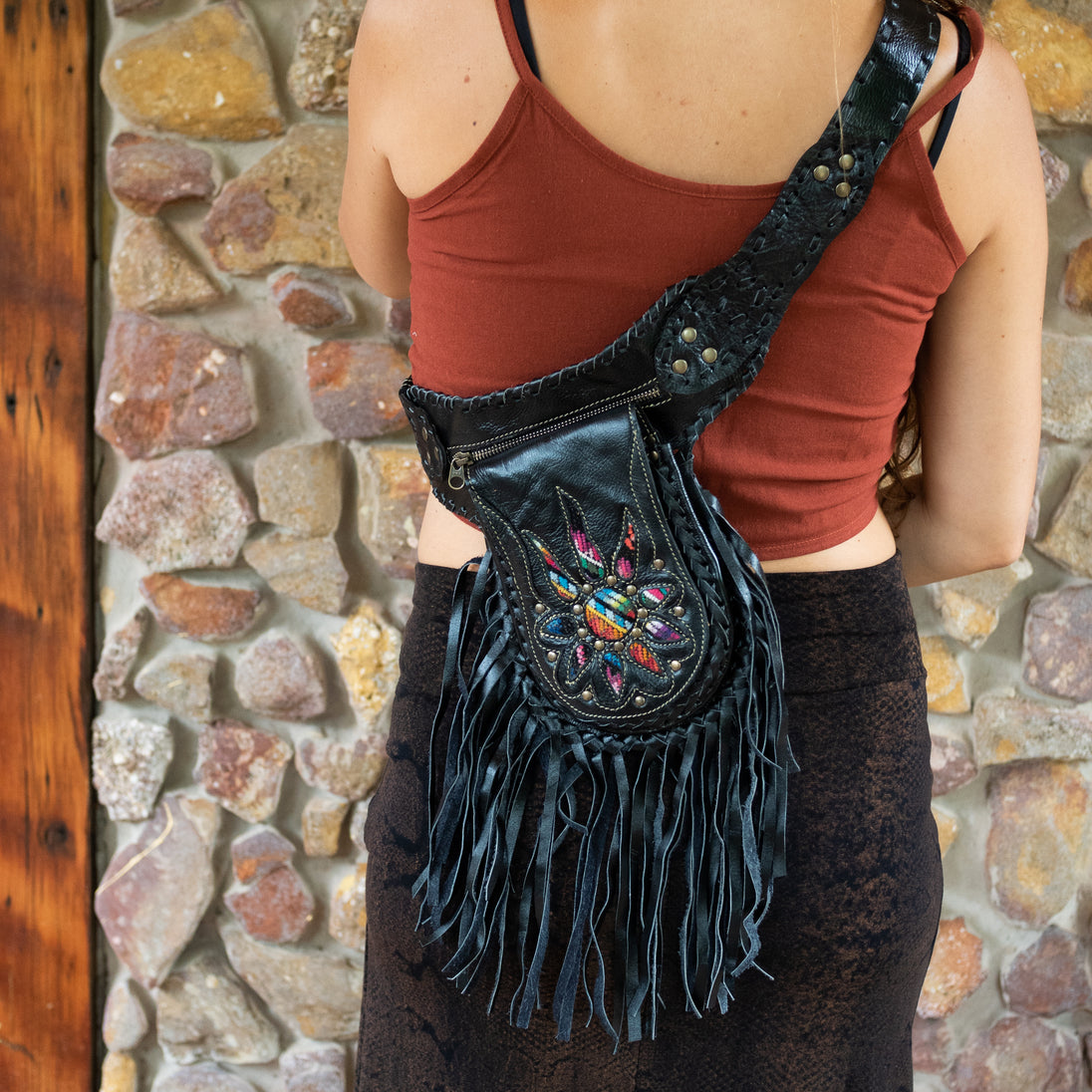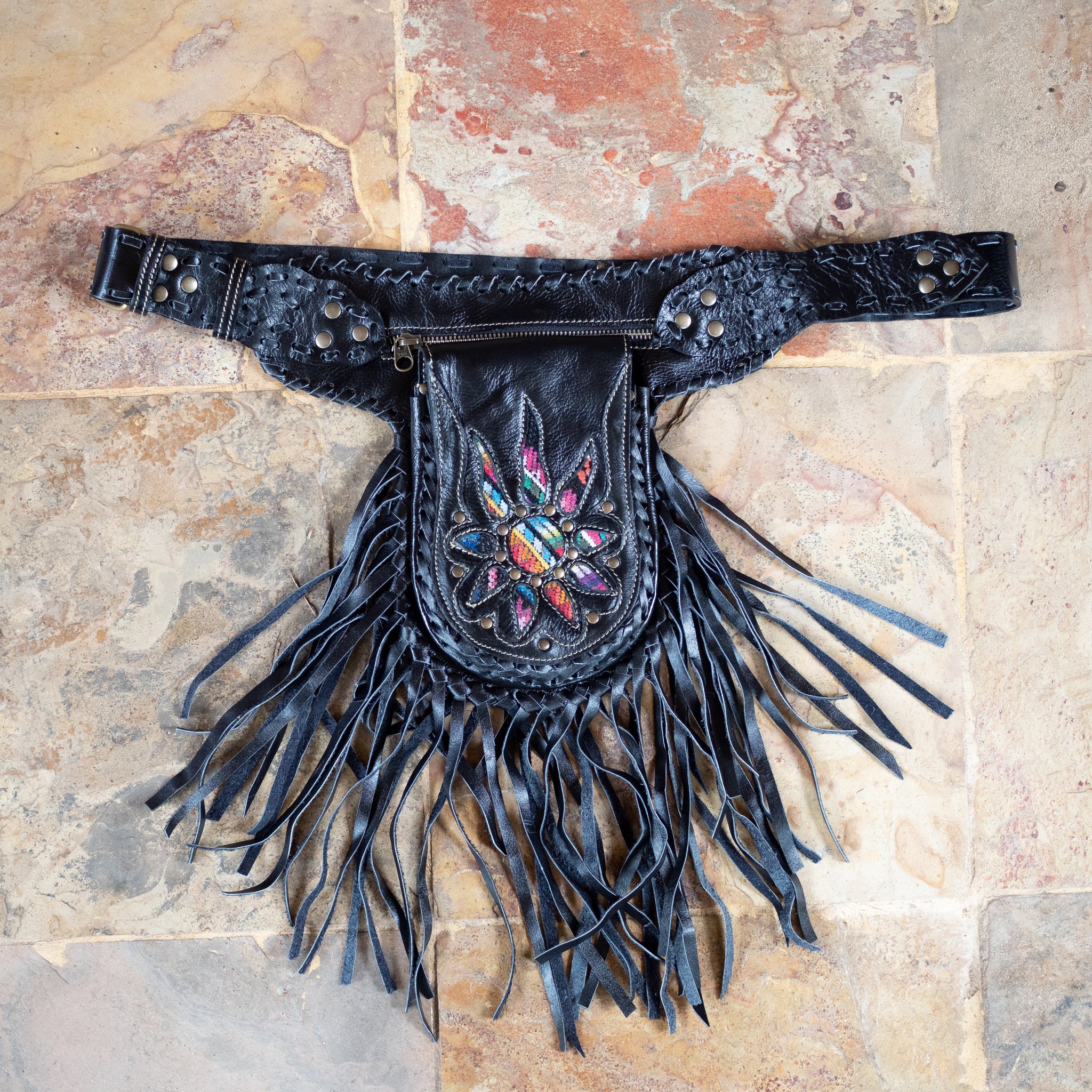 Black Bohemian Leather Festival Belt with Tassels and Embroidery