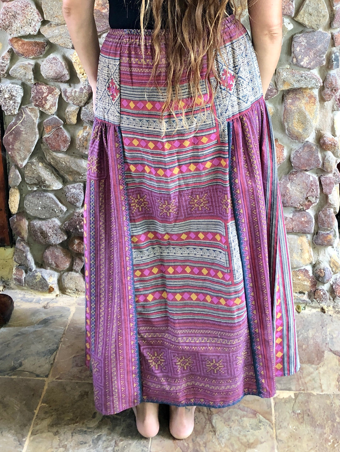 This long skirt made from natural fibres is printed with hill-tribe embroidery patterns. With a comfortable elasticated waistband and it can be worn low on the hips or in a high waisted style.