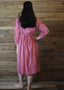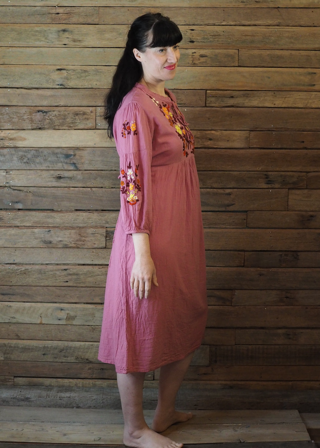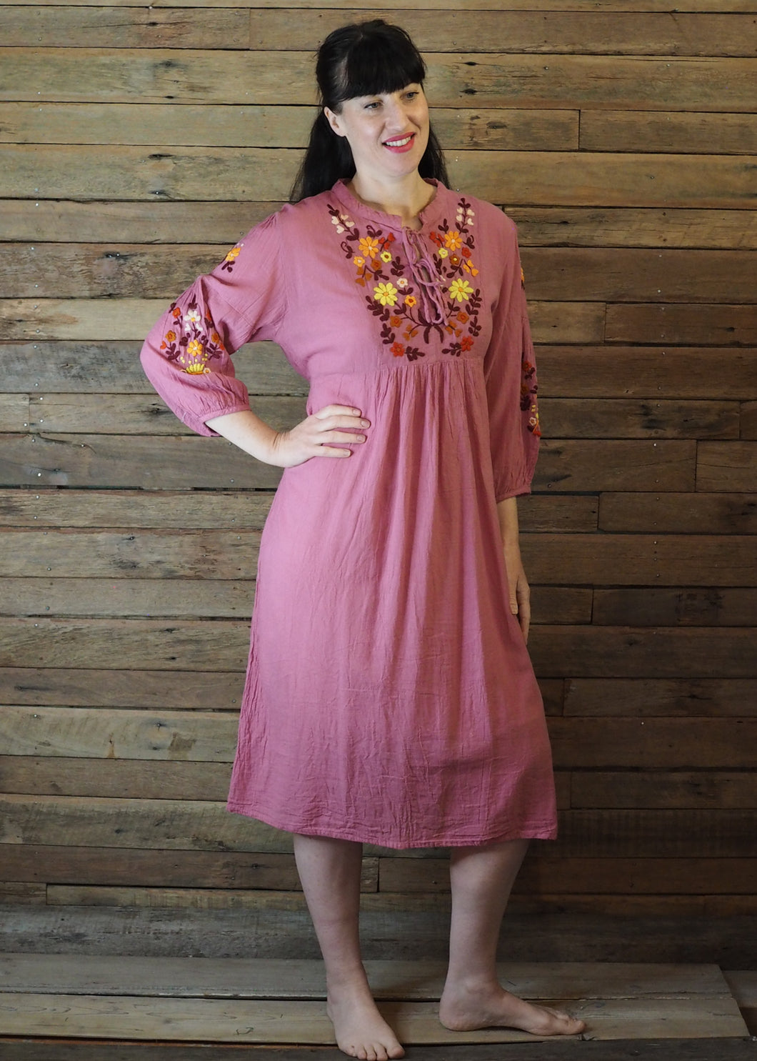 With exquisite hand-embroidered Mexican flower motifs decorating the collar and sleeves, this beautiful dress was designed to fit a bigger bust and a broad back.