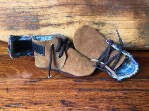 These baby moccasins are the perfect gift for any expecting mother or new parents or for your special one’s 1st birthday! Suitable as a first crawling or walking shoe, these Baby Moccasins are full of fun-coloured suede leather and antique fabrics to match.