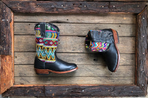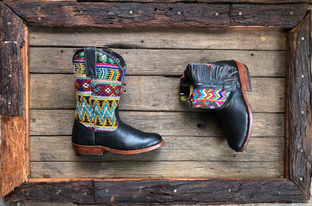 These "two-in-one" boots can be worn as Cowgirl Boots or rolled down as Ankle Boots. Handmade by an Indigenous Guatemalan family of shoe-makers with three generations of experience, these boots have compressed leather soles which can be resoled and can last up to 30 years if cared for well.