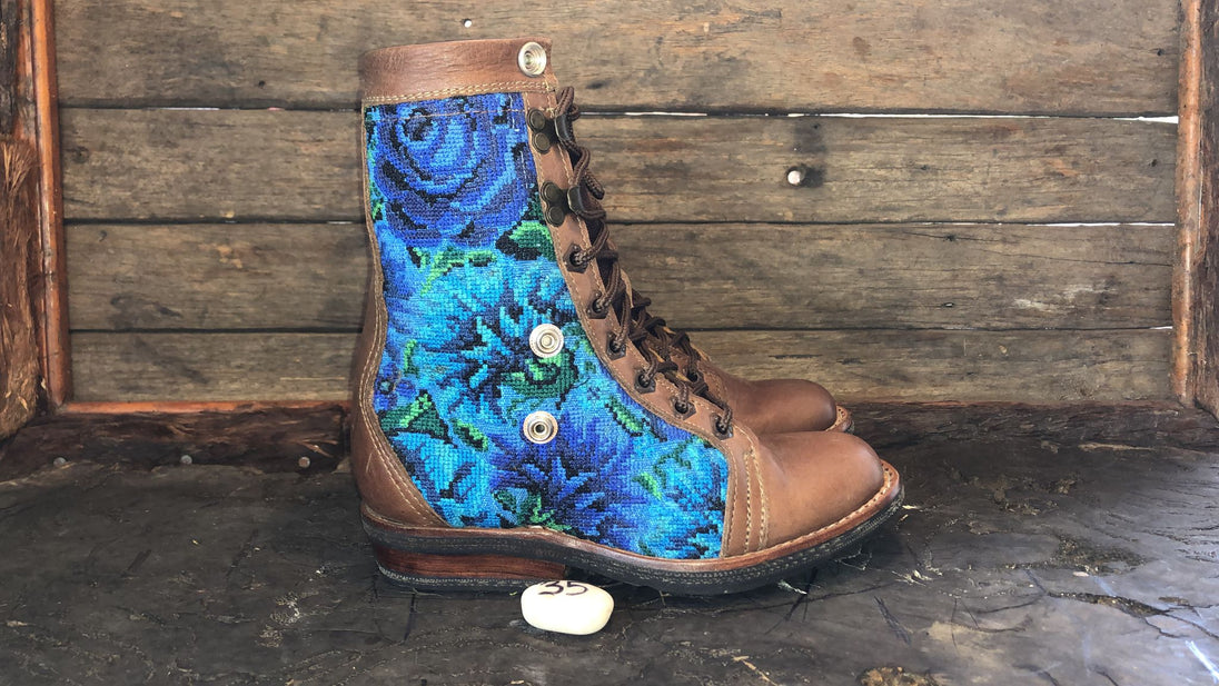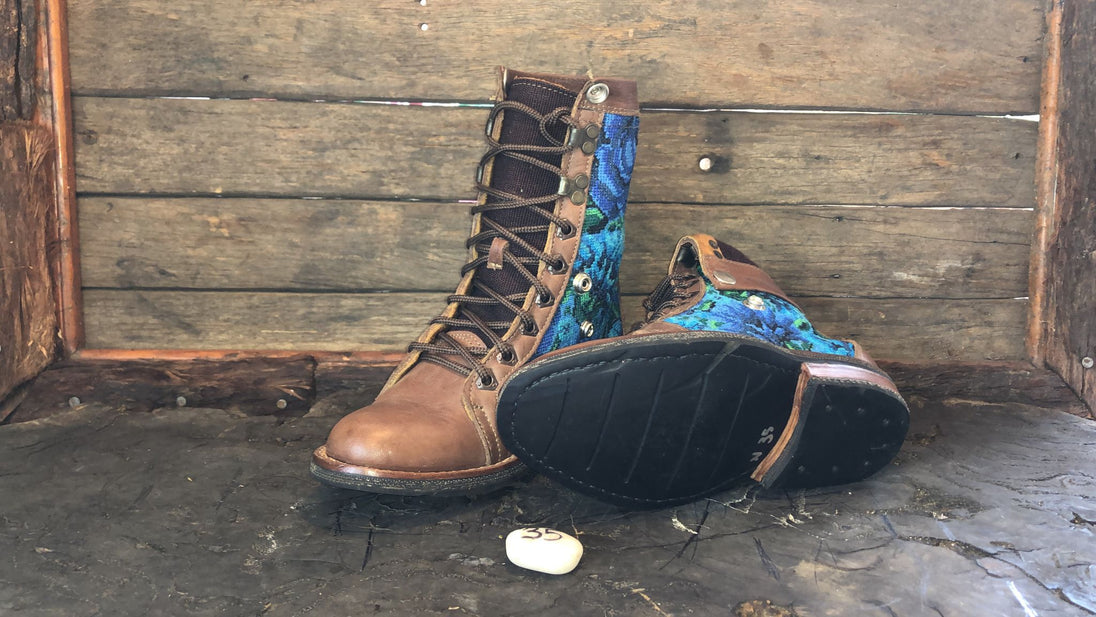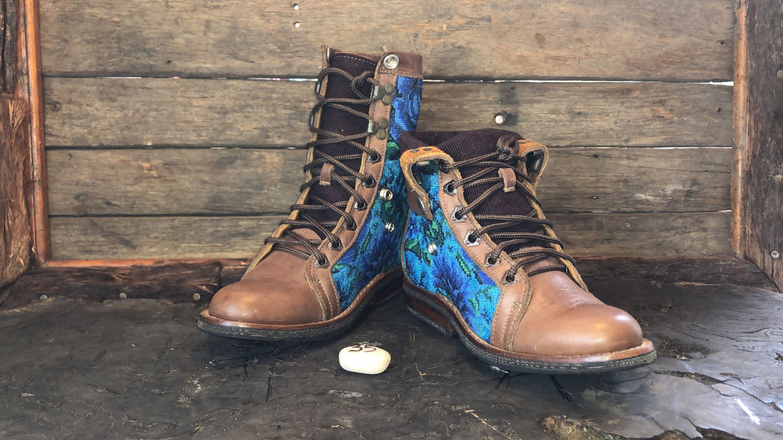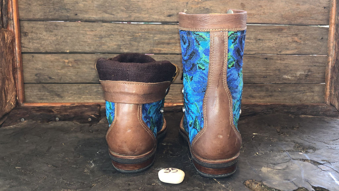 Antique hand-embroidered blouses with Mayan symbology are recycled to create a one-of-a-kind boot with a unique combination of external embroidered fabric and a thick, hand-woven cotton tongue.