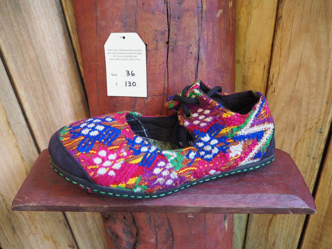Handmade by an Indigenous Guatemalan family of shoe-makers with three generations of experience, the soles are innovatively made from recycled car-tyres and are not only glued but stitched on through every layer of the sole. The fabric used is recycled from Antique hand-embroidered blouses worn and made by women in Guatemala. Each pair of shoes is completely unique.