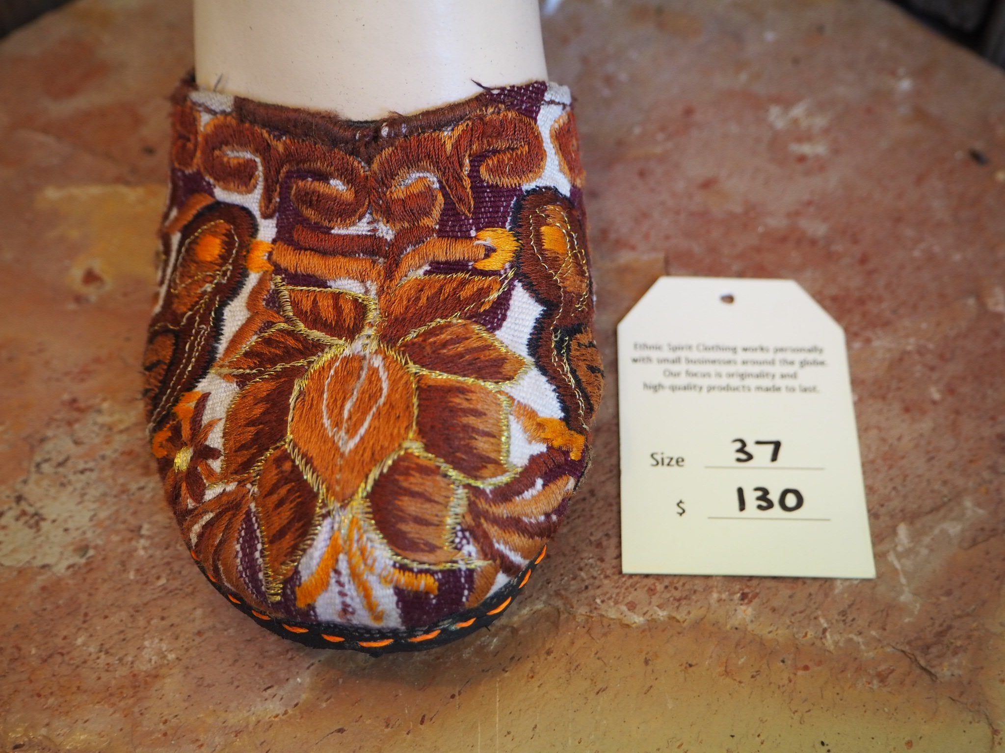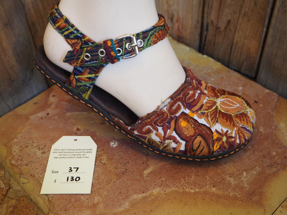 The unique hand-embroidered fabric covering the toe is recycled from the neck pieces of antique Mayan blouses, which are the most exquisitely embroidered part of the work, often depicting flowers and birds from the area where the blouse originates. The circular nature of the neck-piece provides a perfect shape for the Ballerina sandal, enclosing the upper foot and leaving the rest of the foot free.