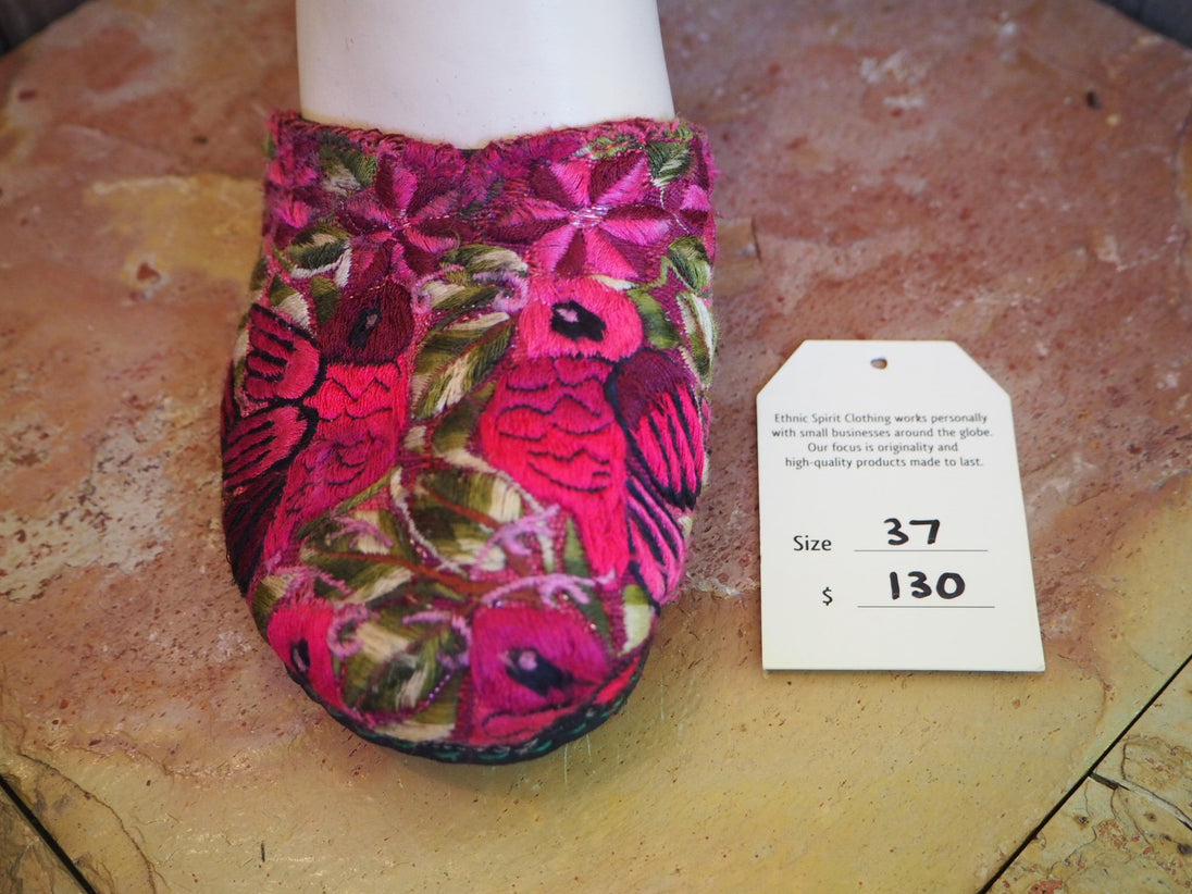 The unique hand-embroidered fabric covering the toe is recycled from the neck pieces of antique Mayan blouses, which are the most exquisitely embroidered part of the work, often depicting flowers and birds from the area where the blouse originates. The circular nature of the neck-piece provides a perfect shape for the Ballerina sandal, enclosing the upper foot and leaving the rest of the foot free.