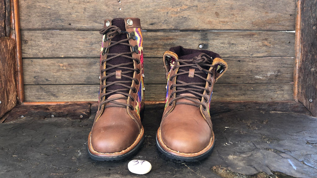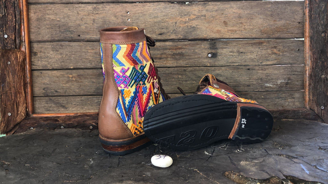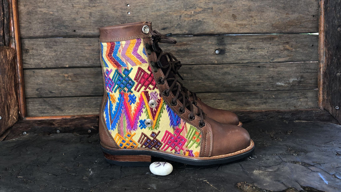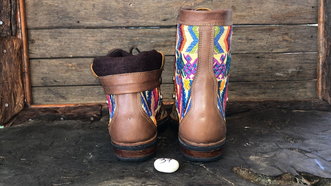 Antique hand-embroidered blouses with Mayan symbology are recycled to create a one-of-a-kind boot with a unique combination of external embroidered fabric and a thick, hand-woven cotton tongue.