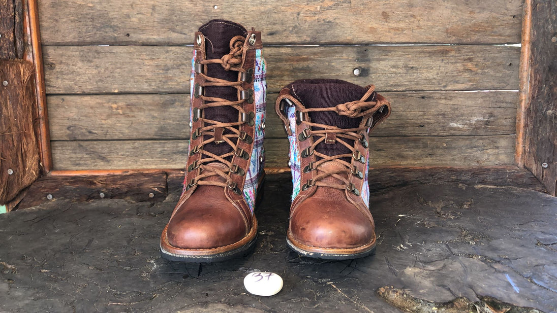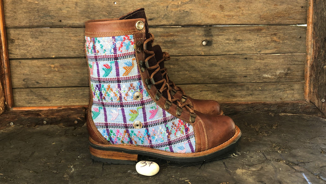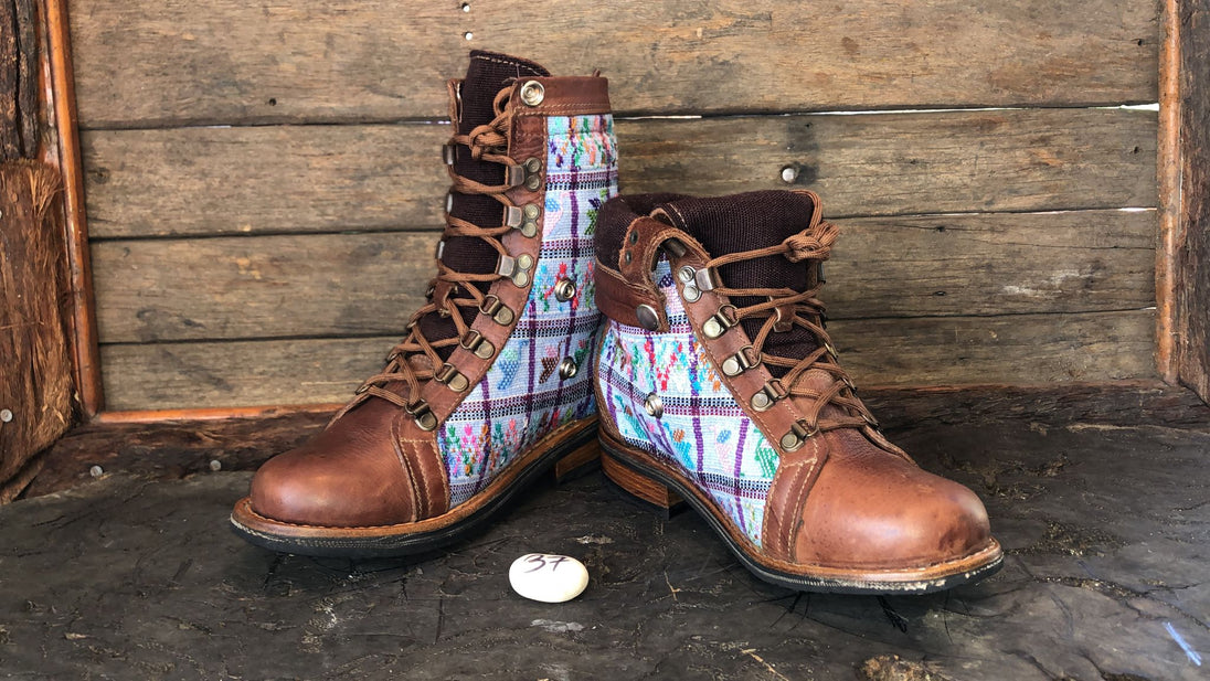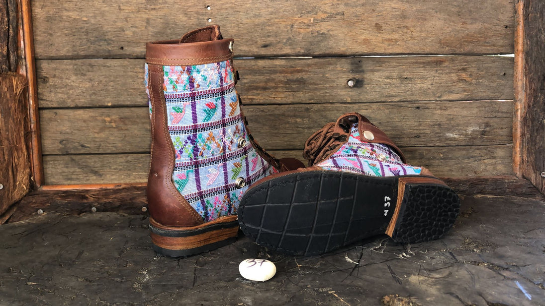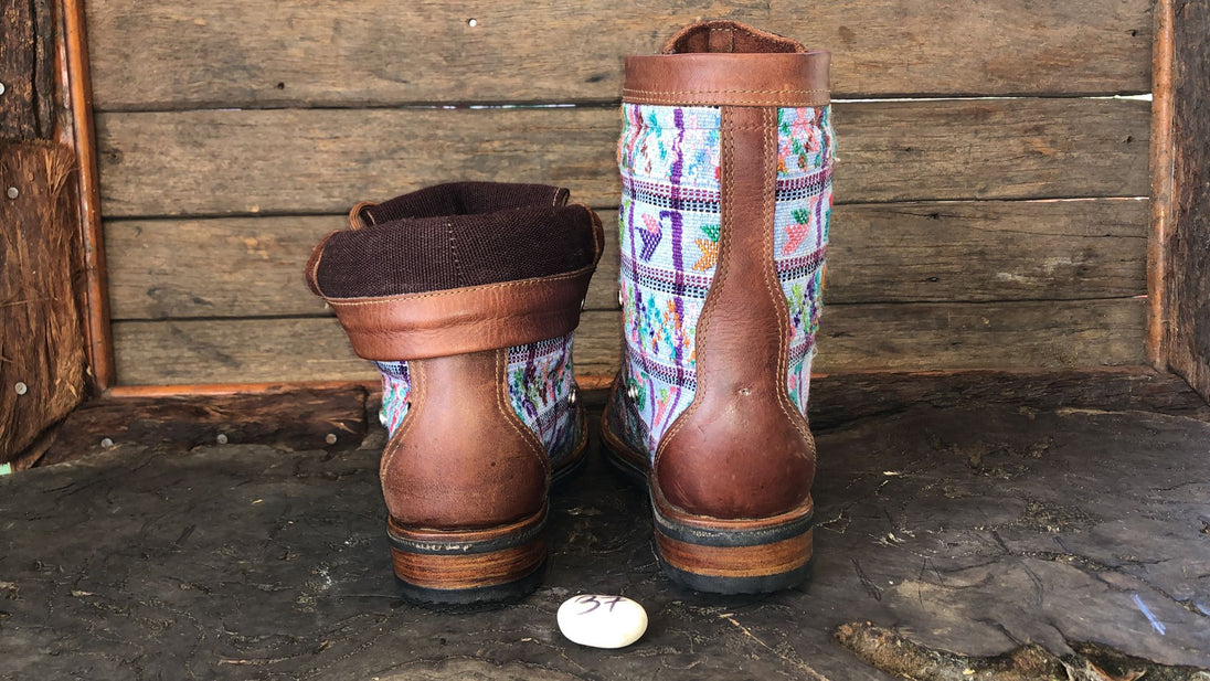 Antique hand-embroidered blouses with Mayan symbology are recycled to create a one-of-a-kind boot with a unique combination of external embroidered fabric and a thick, hand-woven cotton tongue.