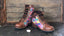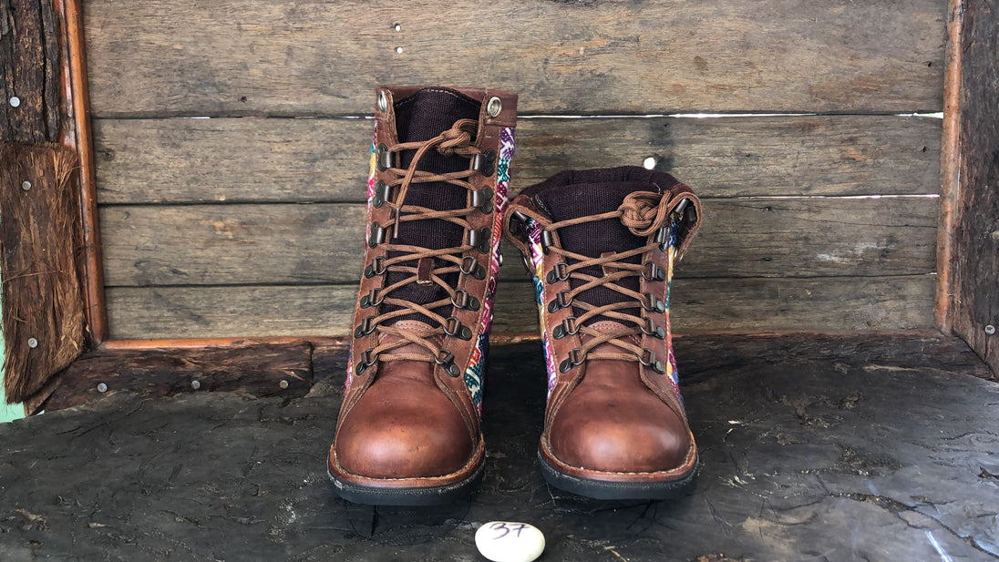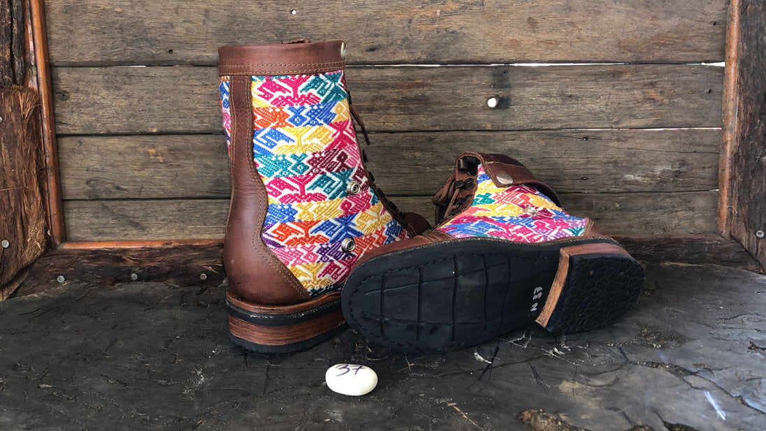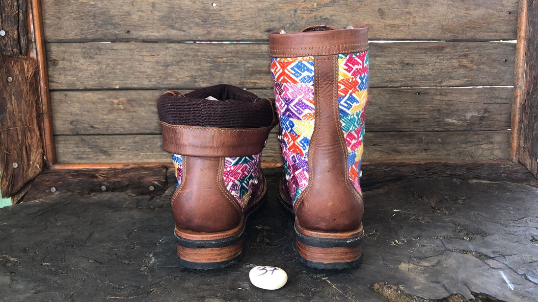 Antique hand-embroidered blouses with Mayan symbology are recycled to create a one-of-a-kind boot with a unique combination of external embroidered fabric and a thick, hand-woven cotton tongue.