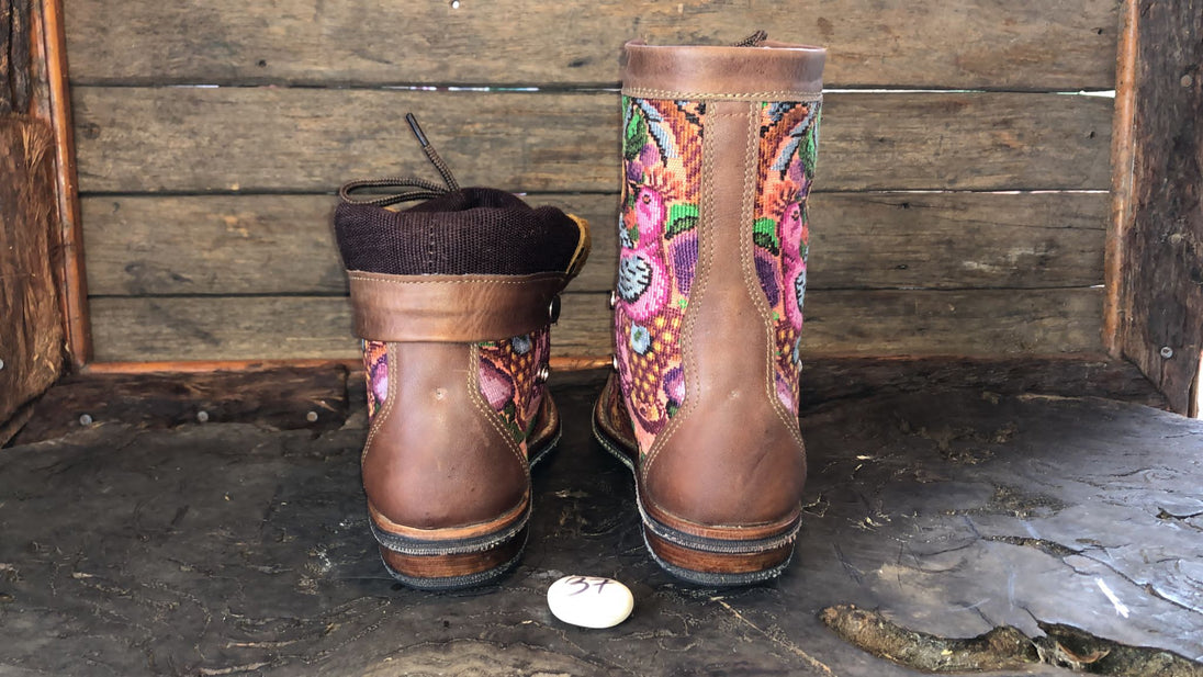 Antique hand-embroidered blouses with Mayan symbology are recycled to create a one-of-a-kind boot with a unique combination of external embroidered fabric and a thick, hand-woven cotton tongue.