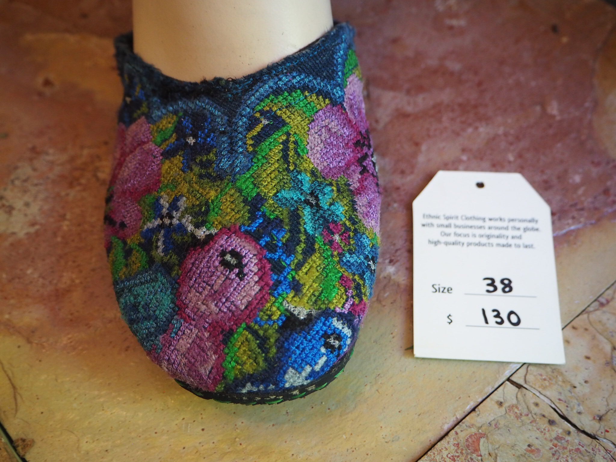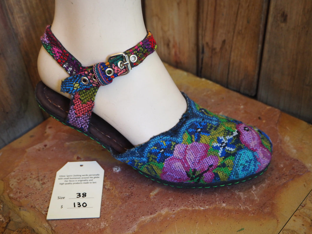 The unique hand-embroidered fabric covering the toe is recycled from the neck pieces of antique Mayan blouses, which are the most exquisitely embroidered part of the work, often depicting flowers and birds from the area where the blouse originates. The circular nature of the neck-piece provides a perfect shape for the Ballerina sandal, enclosing the upper foot and leaving the rest of the foot free.