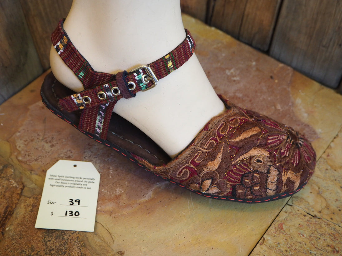 The unique hand-embroidered fabric covering the toe is recycled from the neck pieces of antique Mayan blouses, which are the most exquisitely embroidered part of the work, often depicting flowers and birds from the area where the blouse originates. The circular nature of the neck-piece provides a perfect shape for the Ballerina sandal, enclosing the upper foot and leaving the rest of the foot free.