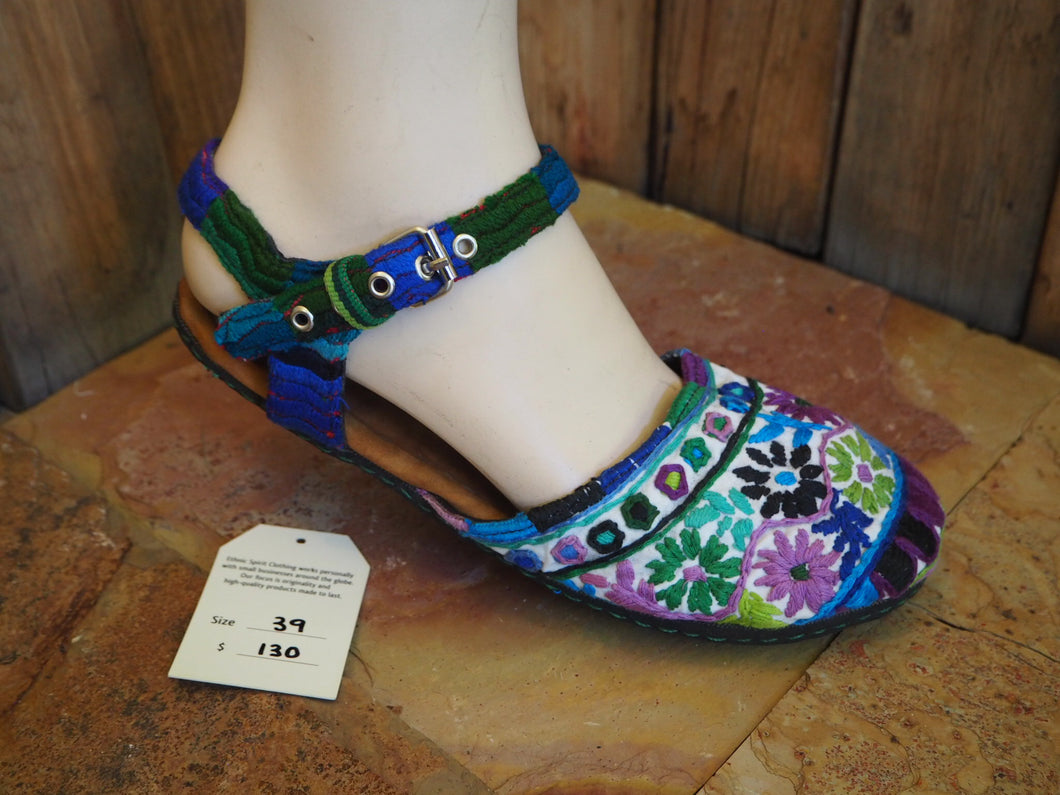 The unique hand-embroidered fabric covering the toe is recycled from the neck pieces of antique Mayan blouses, which are the most exquisitely embroidered part of the work, often depicting flowers and birds from the area where the blouse originates. The circular nature of the neck-piece provides a perfect shape for the Ballerina sandal, enclosing the upper foot and leaving the rest of the foot free.
