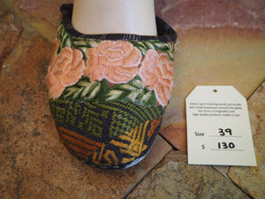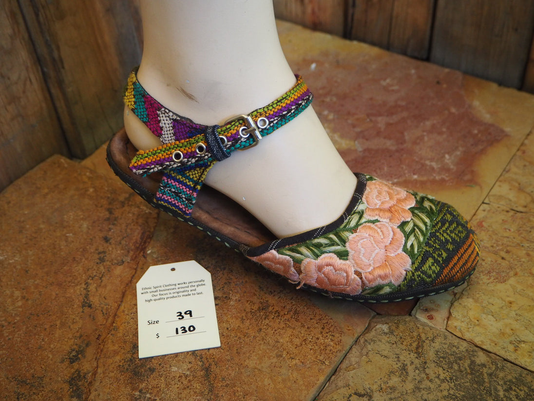 The unique hand-embroidered fabric covering the toe is recycled from the neck pieces of antique Mayan blouses, which are the most exquisitely embroidered part of the work, often depicting flowers and birds from the area where the blouse originates. The circular nature of the neck-piece provides a perfect shape for the Ballerina sandal, enclosing the upper foot and leaving the rest of the foot free.
