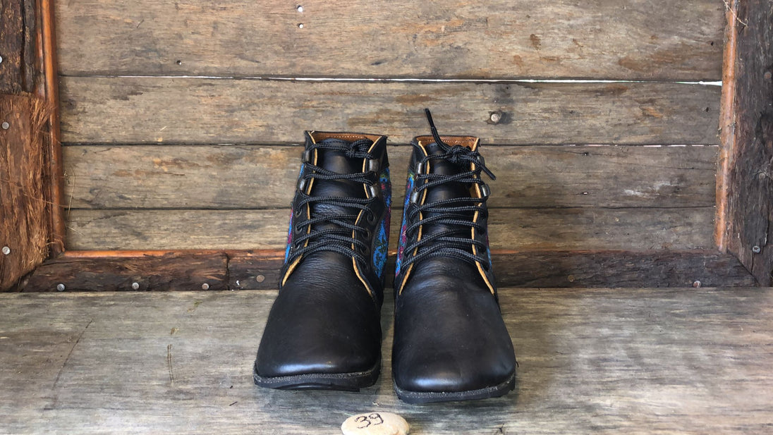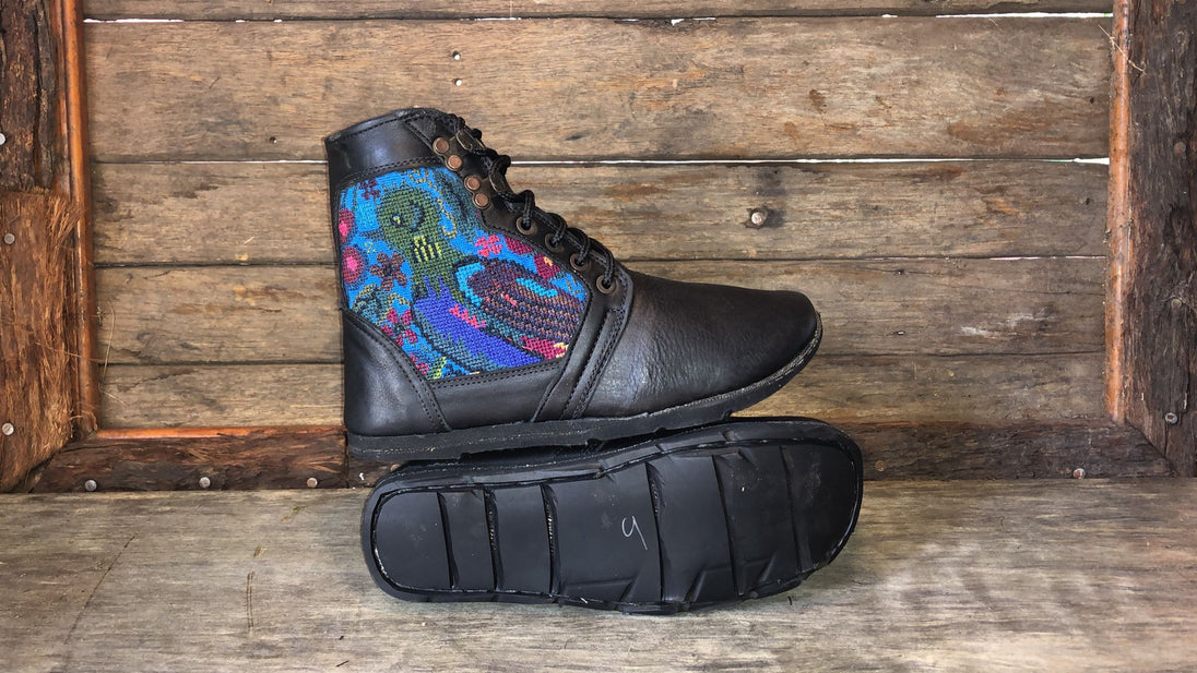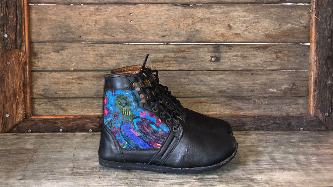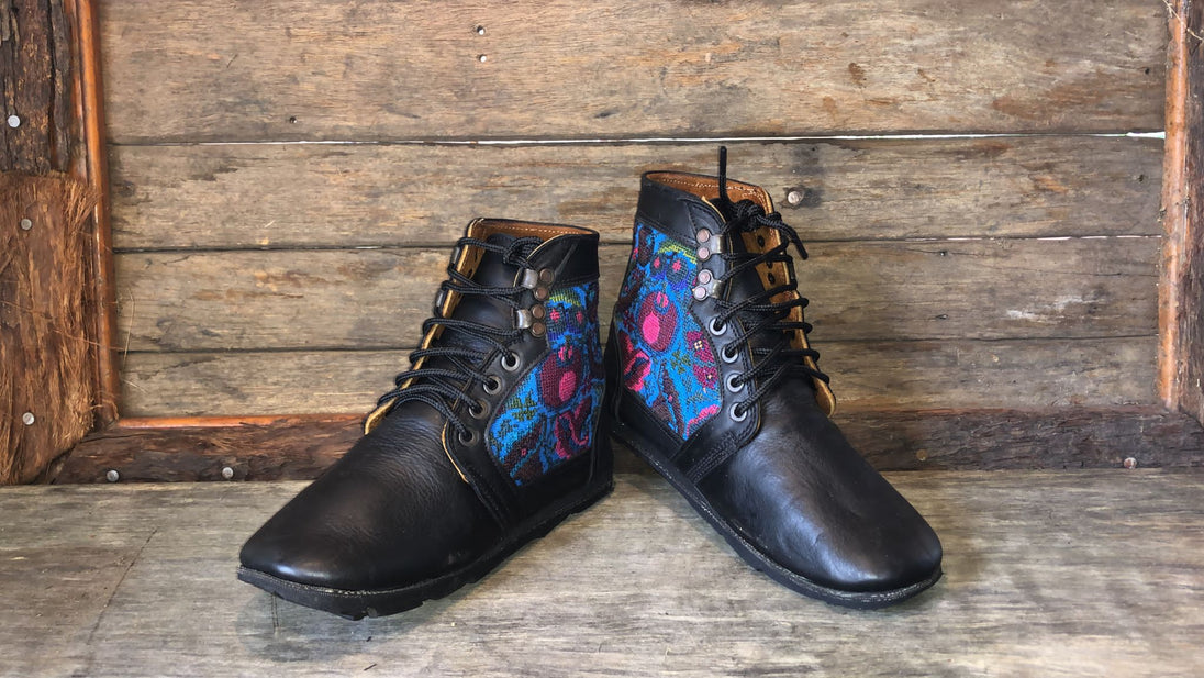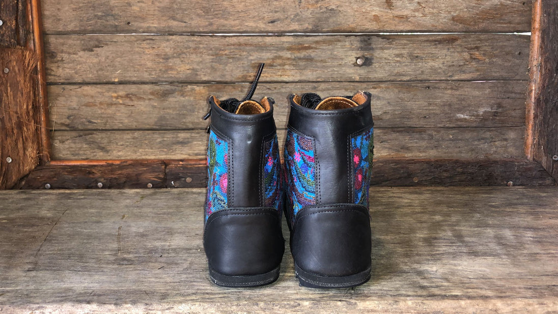 Antique hand-embroidered blouses with Mayan symbology are recycled and integrated into the shoe to create a "one of a kind" boot with its own unique combination of embroidered fabric.