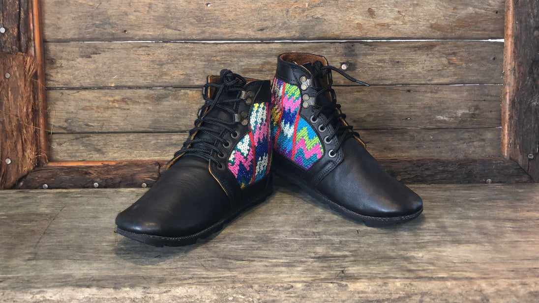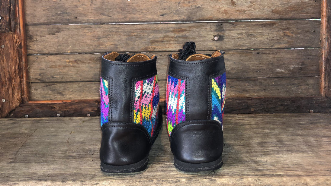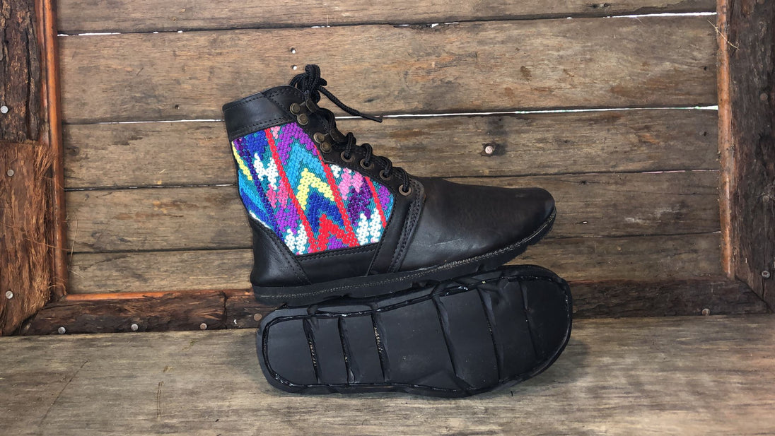 Antique hand-embroidered blouses with Mayan symbology are recycled and integrated into the shoe to create a "one of a kind" boot with its own unique combination of embroidered fabric.