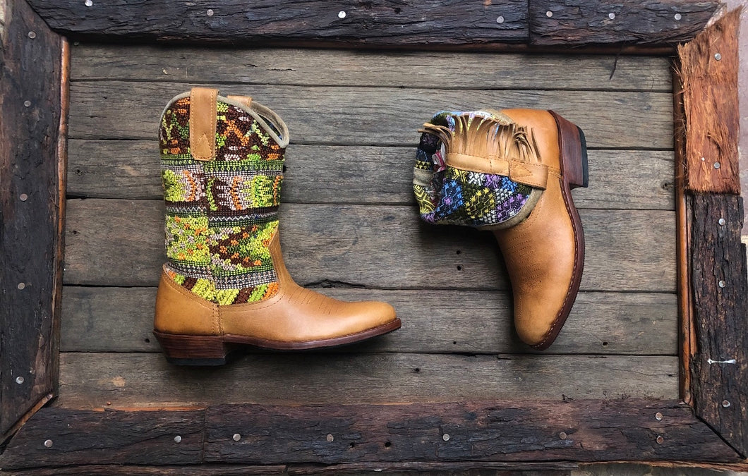 These "two-in-one" boots can be worn as Cowgirl Boots or rolled down as Ankle Boots. Handmade by an Indigenous Guatemalan family of shoe-makers with three generations of experience, these boots have compressed leather soles which can be resoled and can last up to 30 years if cared for well.