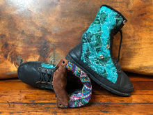 These antique cloth and leather boots can be worn at three different heights; ankle boots, hiker boots and high top boots, with sturdy press-studs to fasten at each height.