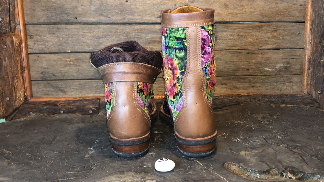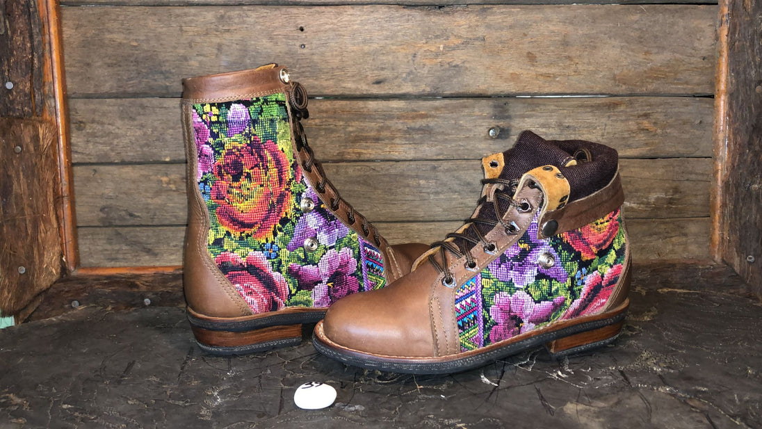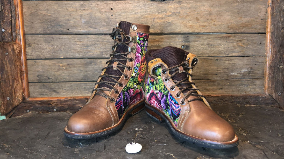 Antique hand-embroidered blouses with Mayan symbology are recycled to create a one-of-a-kind boot with a unique combination of external embroidered fabric and a thick, hand-woven cotton tongue.