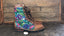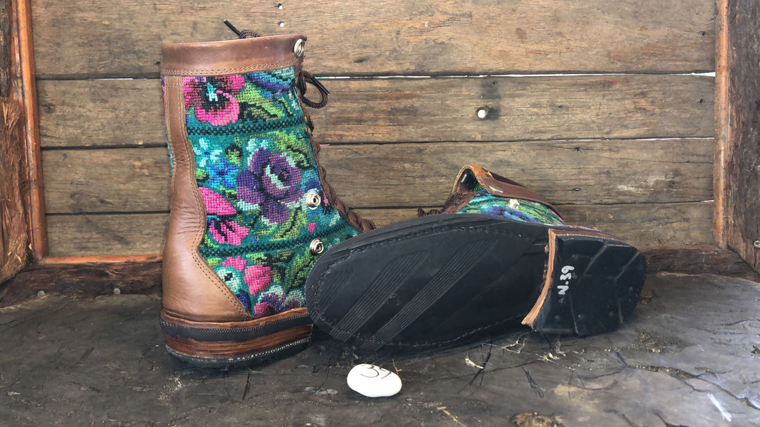 Antique hand-embroidered blouses with Mayan symbology are recycled to create a one-of-a-kind boot with a unique combination of external embroidered fabric and a thick, hand-woven cotton tongue.