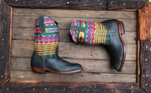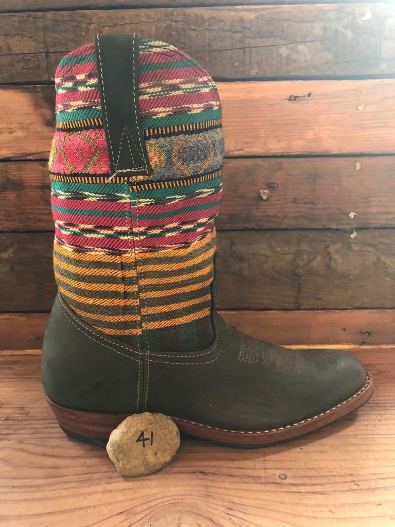 Antique hand-embroidered blouses with Mayan symbology are recycled to create a "one of a kind" boot with a unique combination of external fabric and quality natural leather upper.