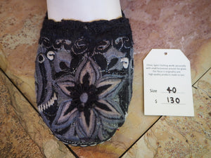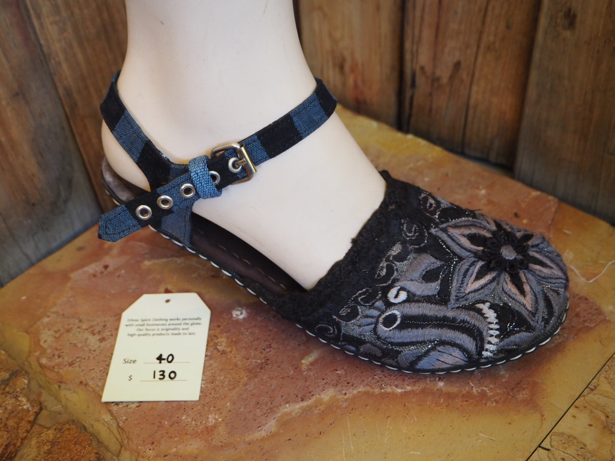The unique hand-embroidered fabric covering the toe is recycled from the neck pieces of antique Mayan blouses, which are the most exquisitely embroidered part of the work, often depicting flowers and birds from the area where the blouse originates. The circular nature of the neck-piece provides a perfect shape for the Ballerina sandal, enclosing the upper foot and leaving the rest of the foot free.