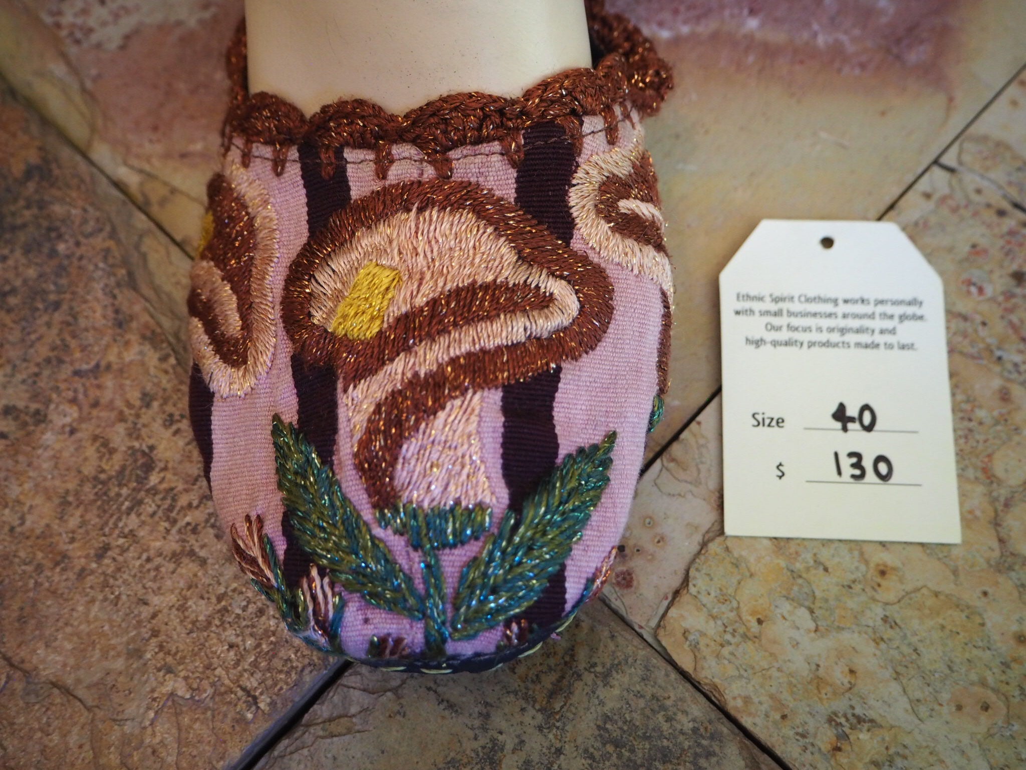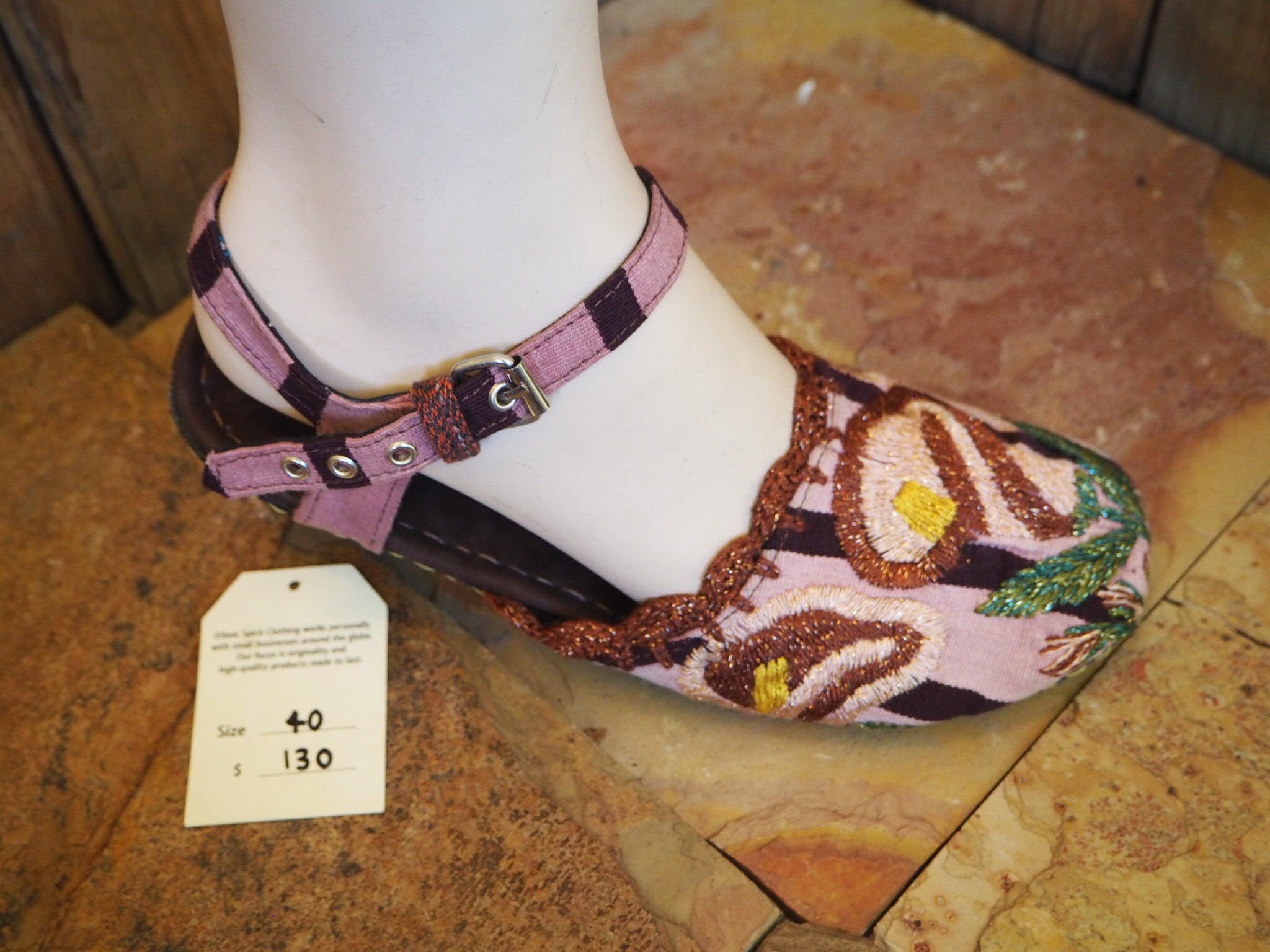 The unique hand-embroidered fabric covering the toe is recycled from the neck pieces of antique Mayan blouses, which are the most exquisitely embroidered part of the work, often depicting flowers and birds from the area where the blouse originates. The circular nature of the neck-piece provides a perfect shape for the Ballerina sandal, enclosing the upper foot and leaving the rest of the foot free.