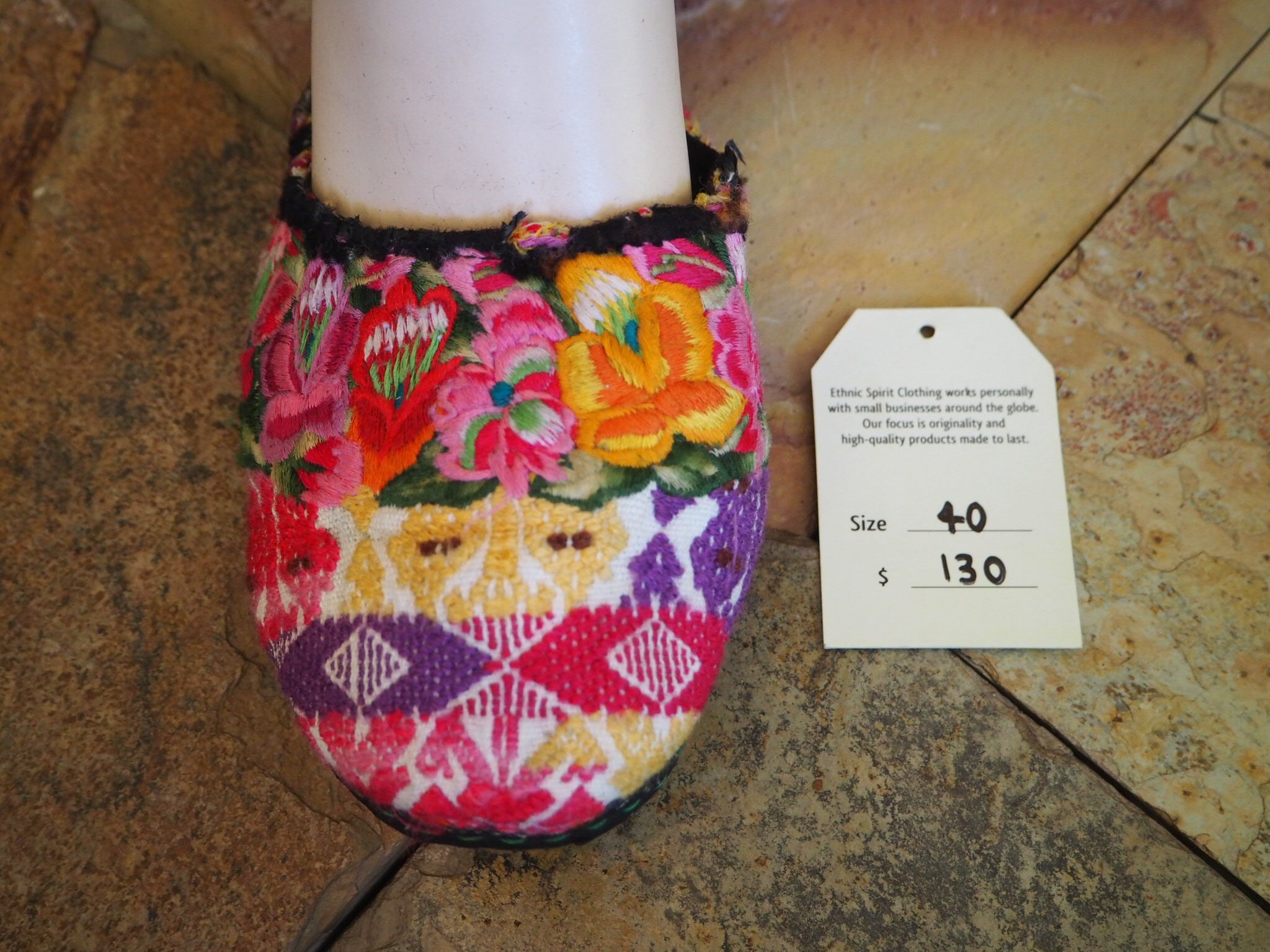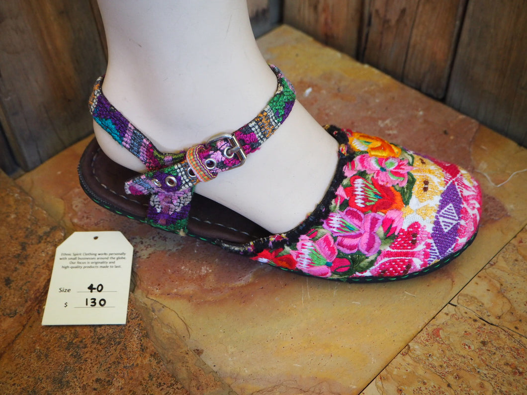 The unique hand-embroidered fabric covering the toe is recycled from the neck pieces of antique Mayan blouses, which are the most exquisitely embroidered part of the work, often depicting flowers and birds from the area where the blouse originates. The circular nature of the neck-piece provides a perfect shape for the Ballerina sandal, enclosing the upper foot and leaving the rest of the foot free.
