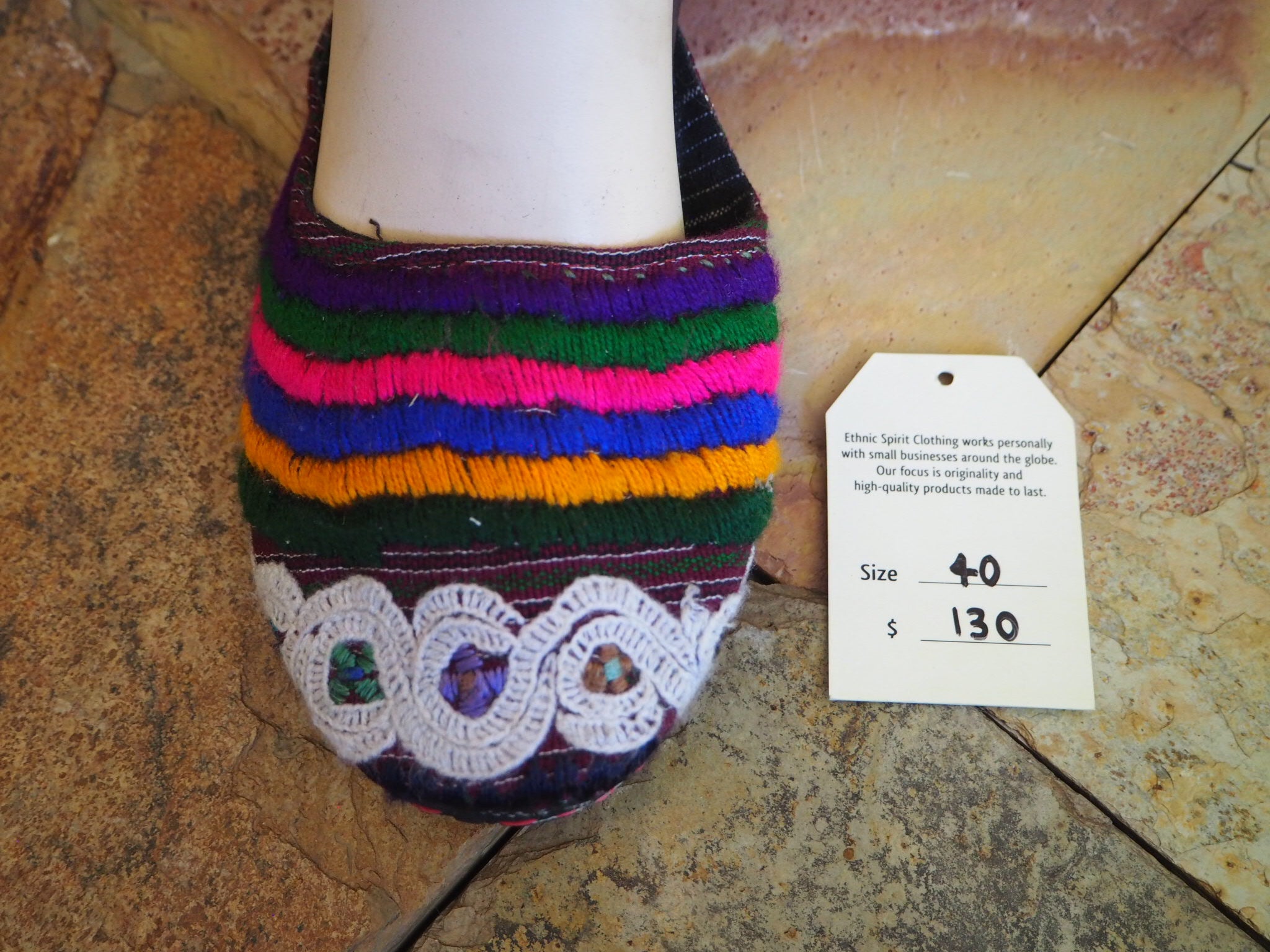 The unique hand-embroidered fabric covering the toe is recycled from the neck pieces of antique Mayan blouses, which are the most exquisitely embroidered part of the work, often depicting flowers and birds from the area where the blouse originates. The circular nature of the neck-piece provides a perfect shape for the Ballerina sandal, enclosing the upper foot and leaving the rest of the foot free.
