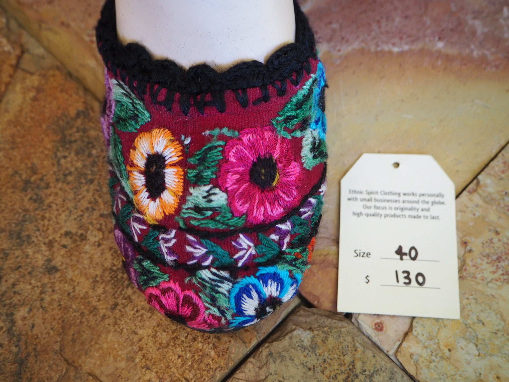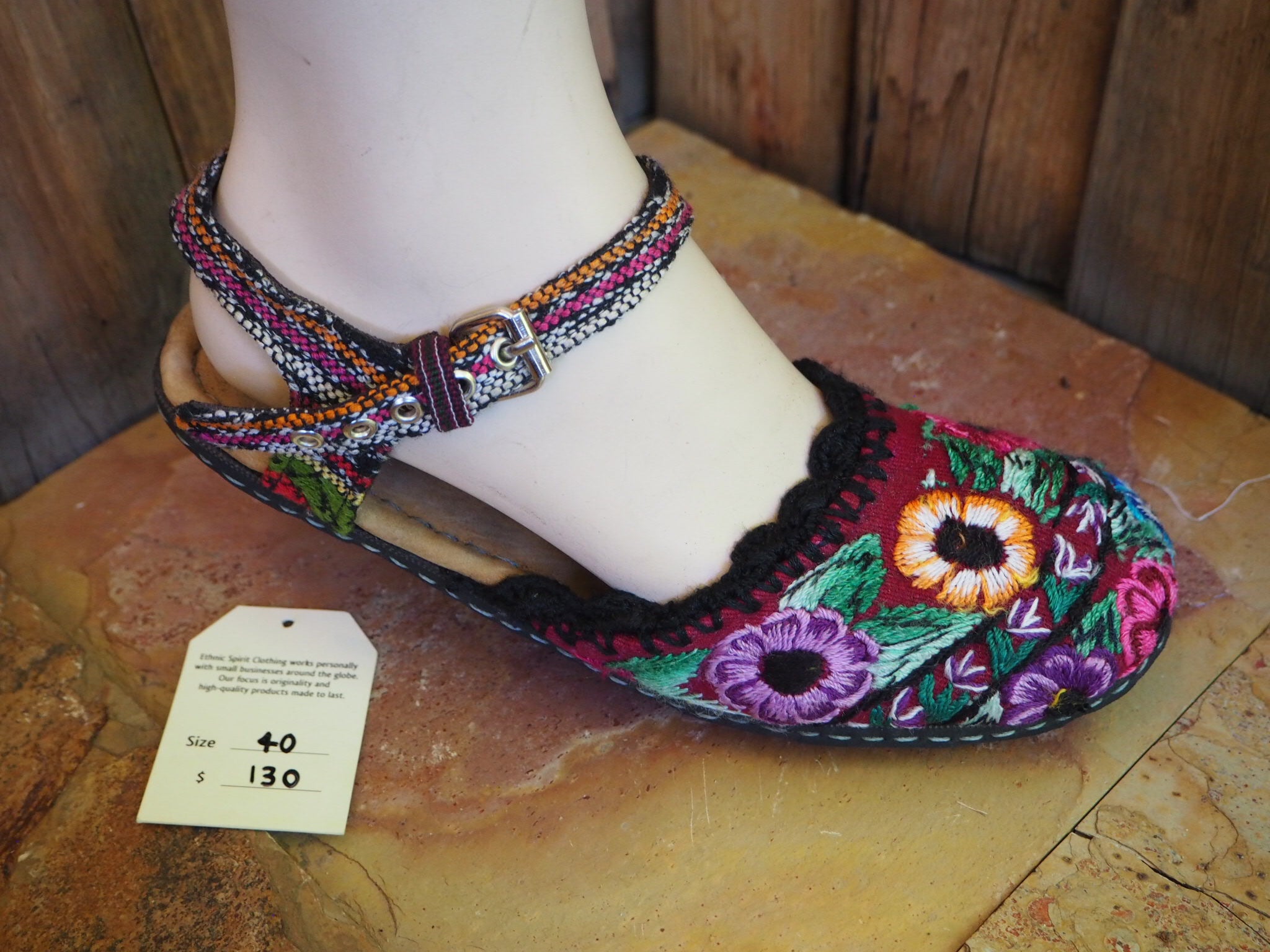 The unique hand-embroidered fabric covering the toe is recycled from the neck pieces of antique Mayan blouses, which are the most exquisitely embroidered part of the work, often depicting flowers and birds from the area where the blouse originates. The circular nature of the neck-piece provides a perfect shape for the Ballerina sandal, enclosing the upper foot and leaving the rest of the foot free.