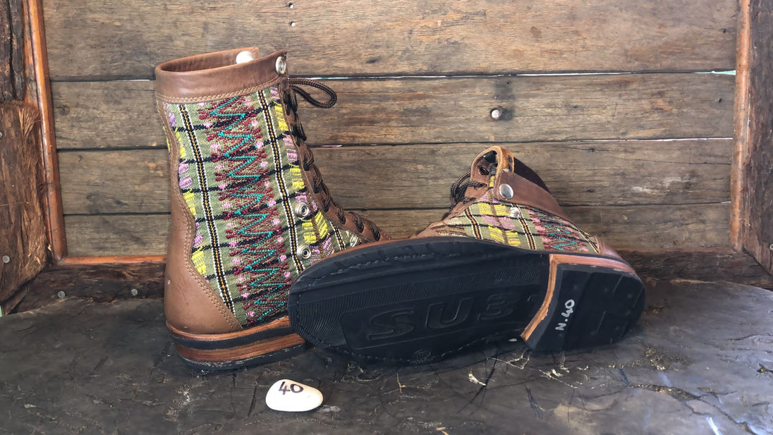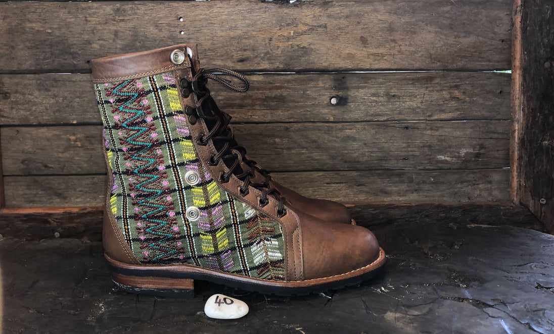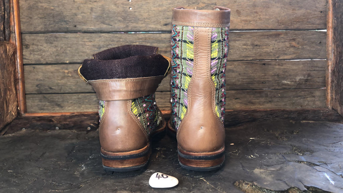 Antique hand-embroidered blouses with Mayan symbology are recycled to create a one-of-a-kind boot with a unique combination of external embroidered fabric and a thick, hand-woven cotton tongue.