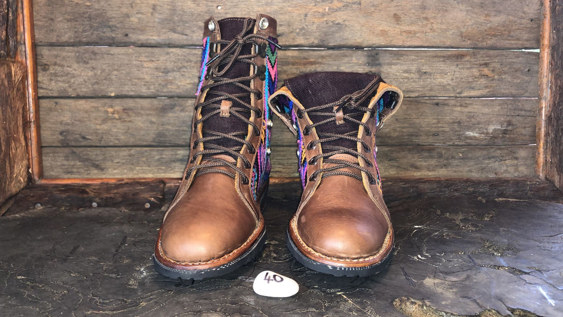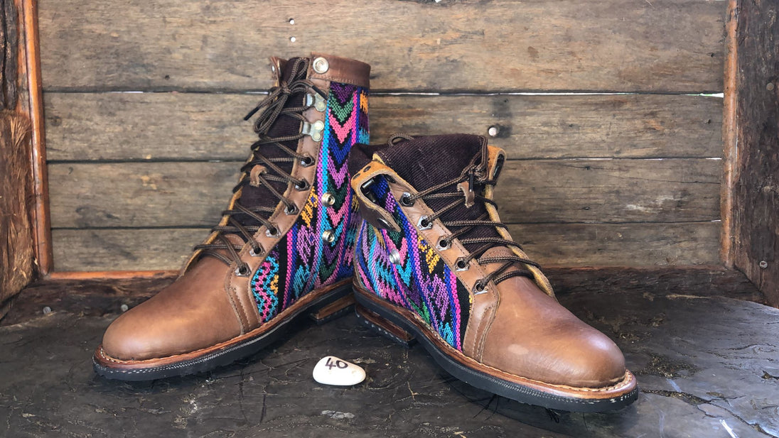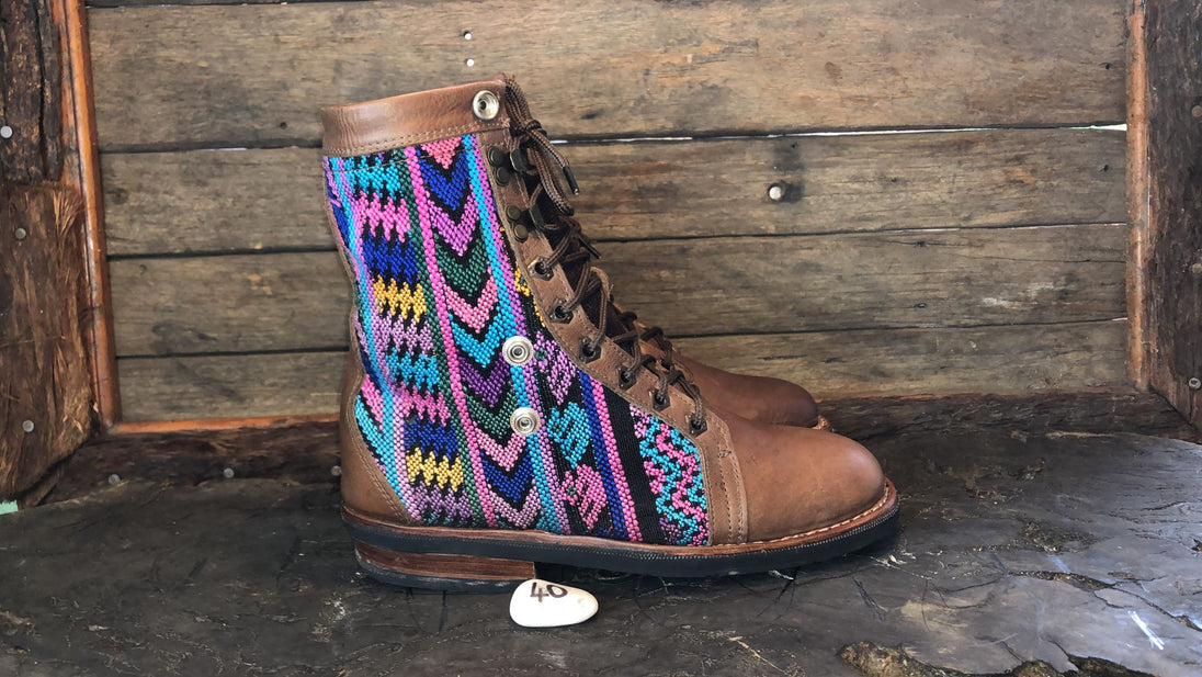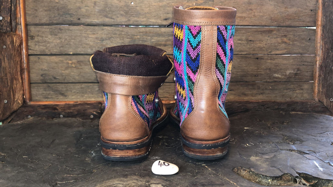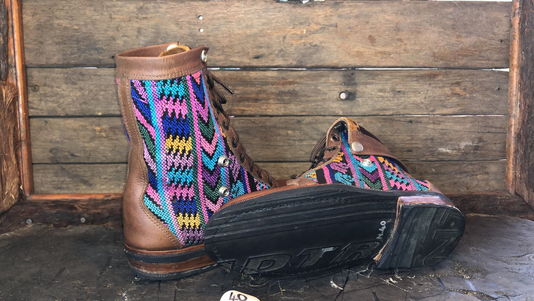 Antique hand-embroidered blouses with Mayan symbology are recycled to create a one-of-a-kind boot with a unique combination of external embroidered fabric and a thick, hand-woven cotton tongue.