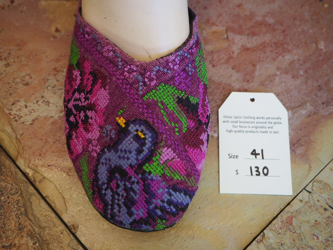 The unique hand-embroidered fabric covering the toe is recycled from the neck pieces of antique Mayan blouses, which are the most exquisitely embroidered part of the work, often depicting flowers and birds from the area where the blouse originates. The circular nature of the neck-piece provides a perfect shape for the Ballerina sandal, enclosing the upper foot and leaving the rest of the foot free.