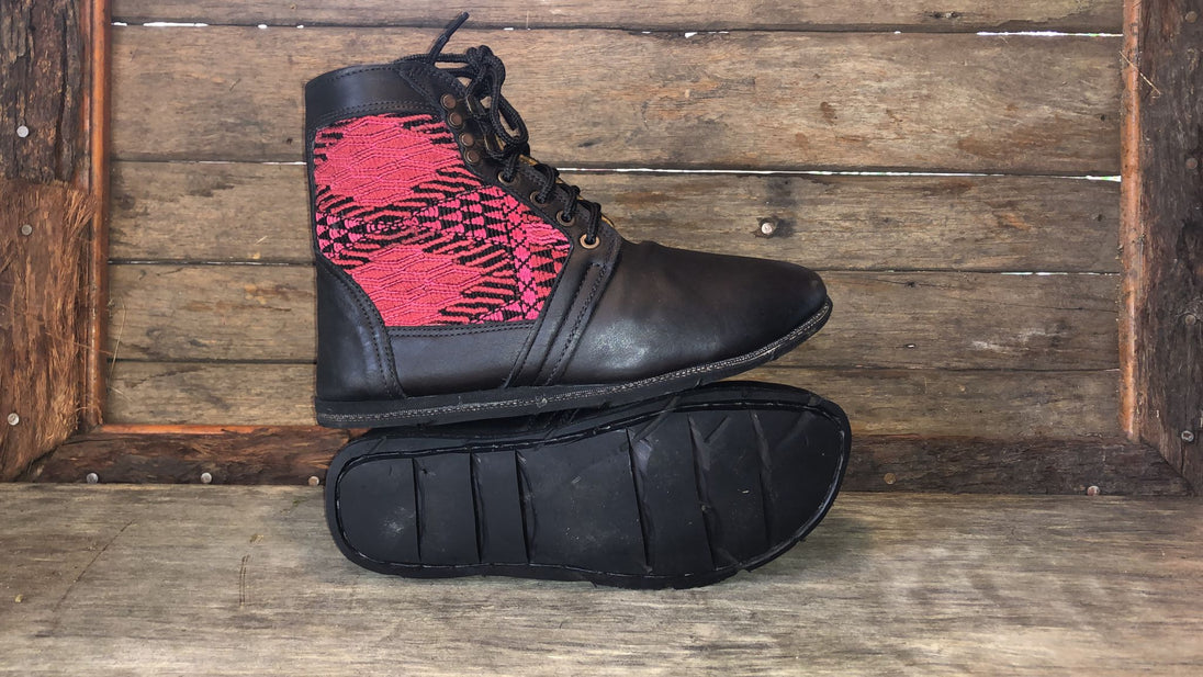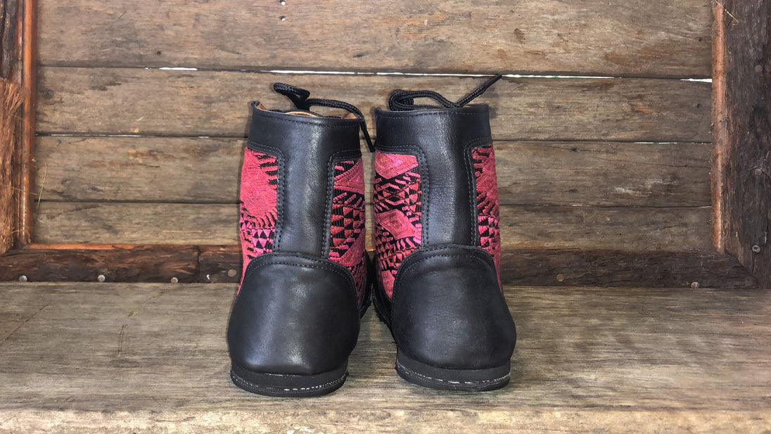 Antique hand-embroidered blouses with Mayan symbology are recycled and integrated into the shoe to create a "one of a kind" boot with its own unique combination of embroidered fabric.