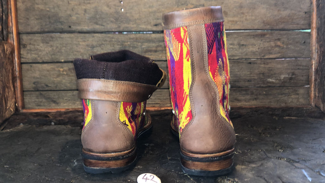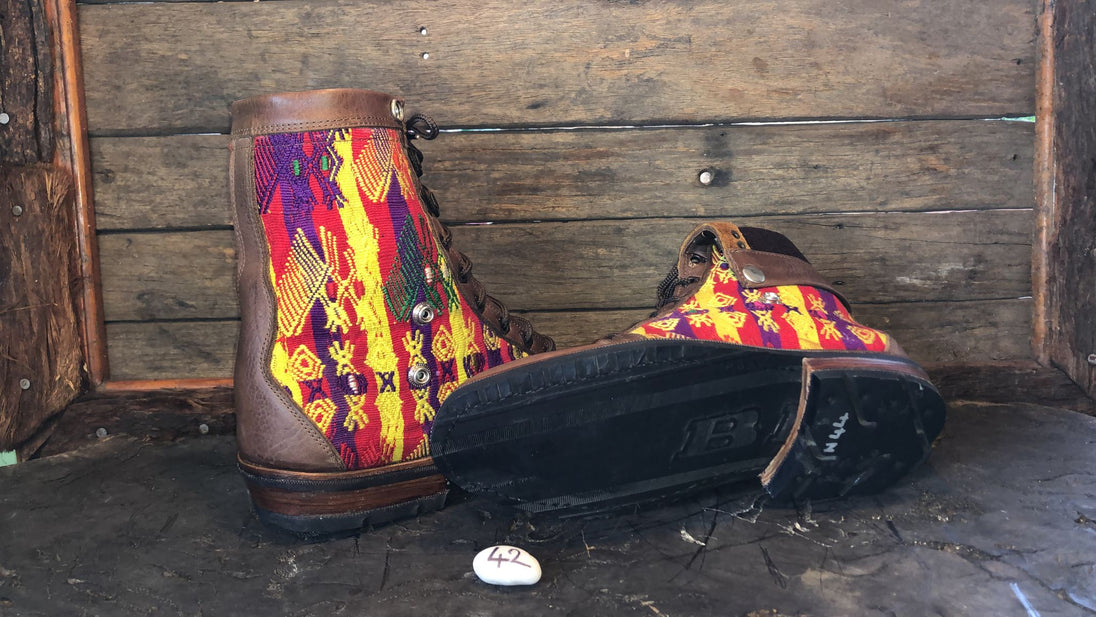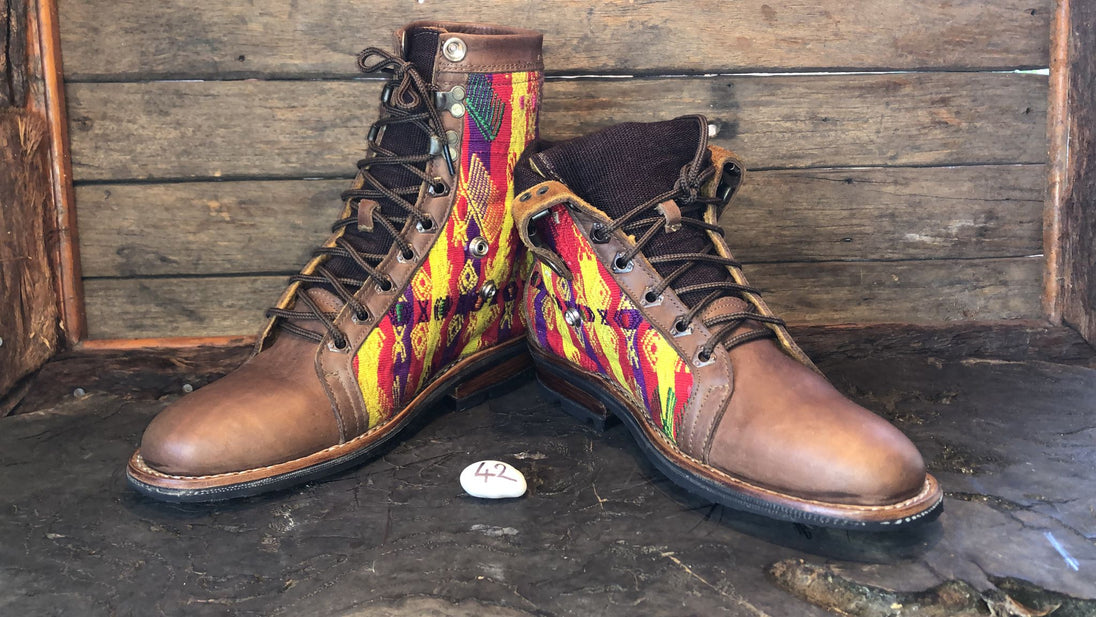 Antique hand-embroidered blouses with Mayan symbology are recycled to create a one-of-a-kind boot with a unique combination of external embroidered fabric and a thick, hand-woven cotton tongue.