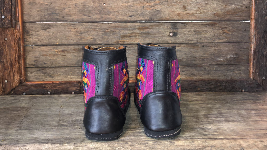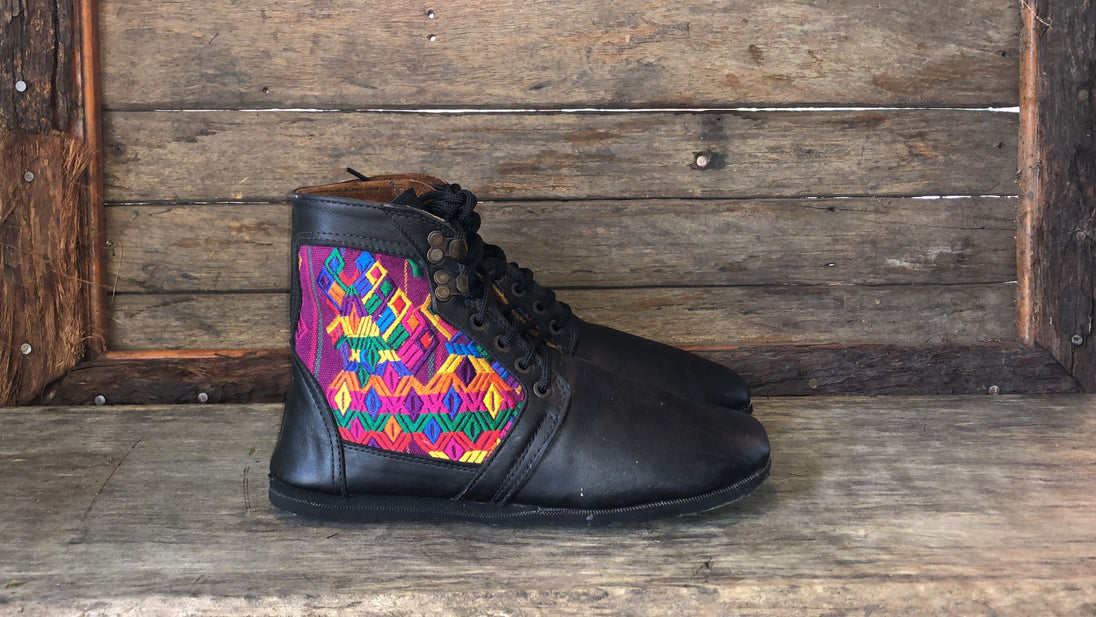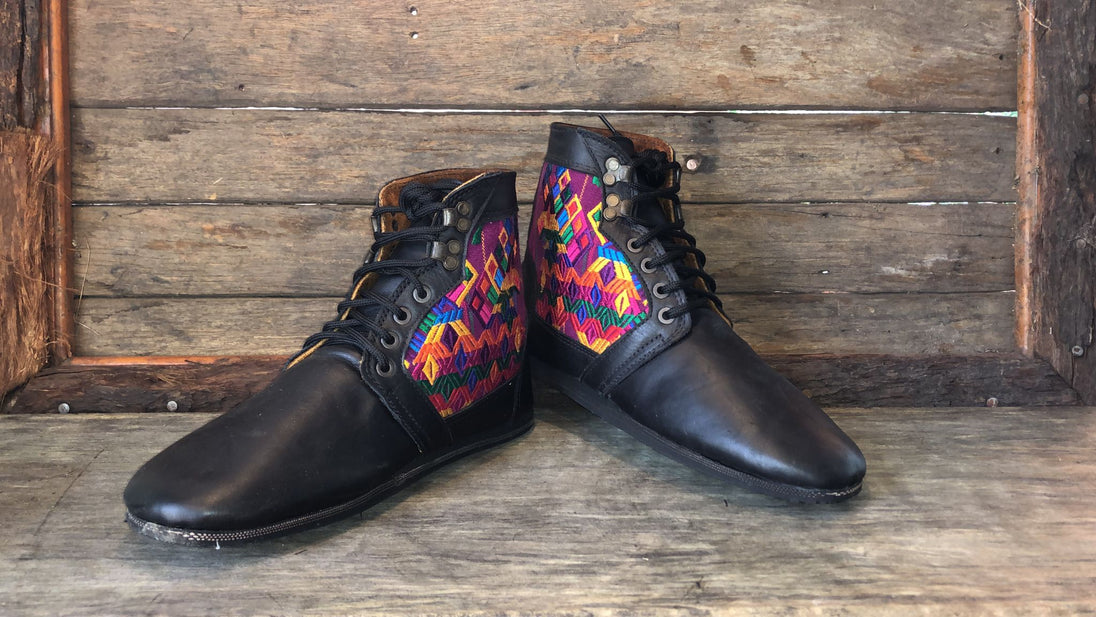 Antique hand-embroidered blouses with Mayan symbology are recycled and integrated into the shoe to create a "one of a kind" boot with its own unique combination of embroidered fabric.