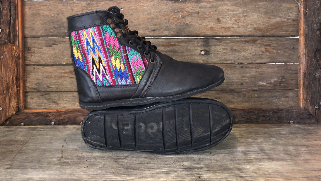 Antique hand-embroidered blouses with Mayan symbology are recycled and integrated into the shoe to create a "one of a kind" boot with its own unique combination of embroidered fabric.