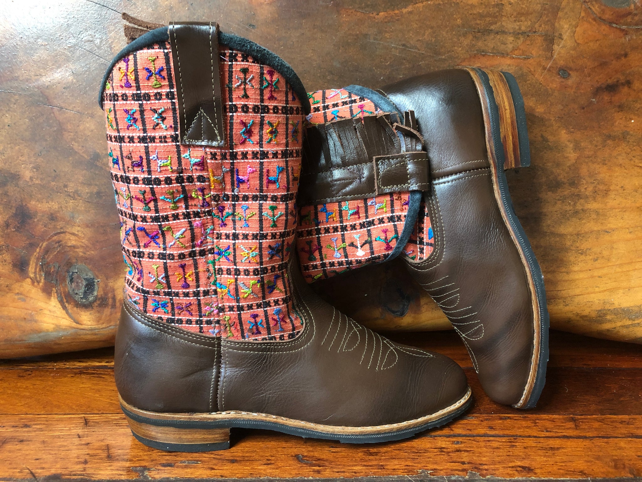 These "two-in-one" boots can be worn as Cowgirl Boots or rolled down as Ankle Boots. Handmade by an Indigenous Guatemalan family of shoe-makers with three generations of experience, these boots have compressed leather soles which can be resoled and can last up to 30 years if cared for well.