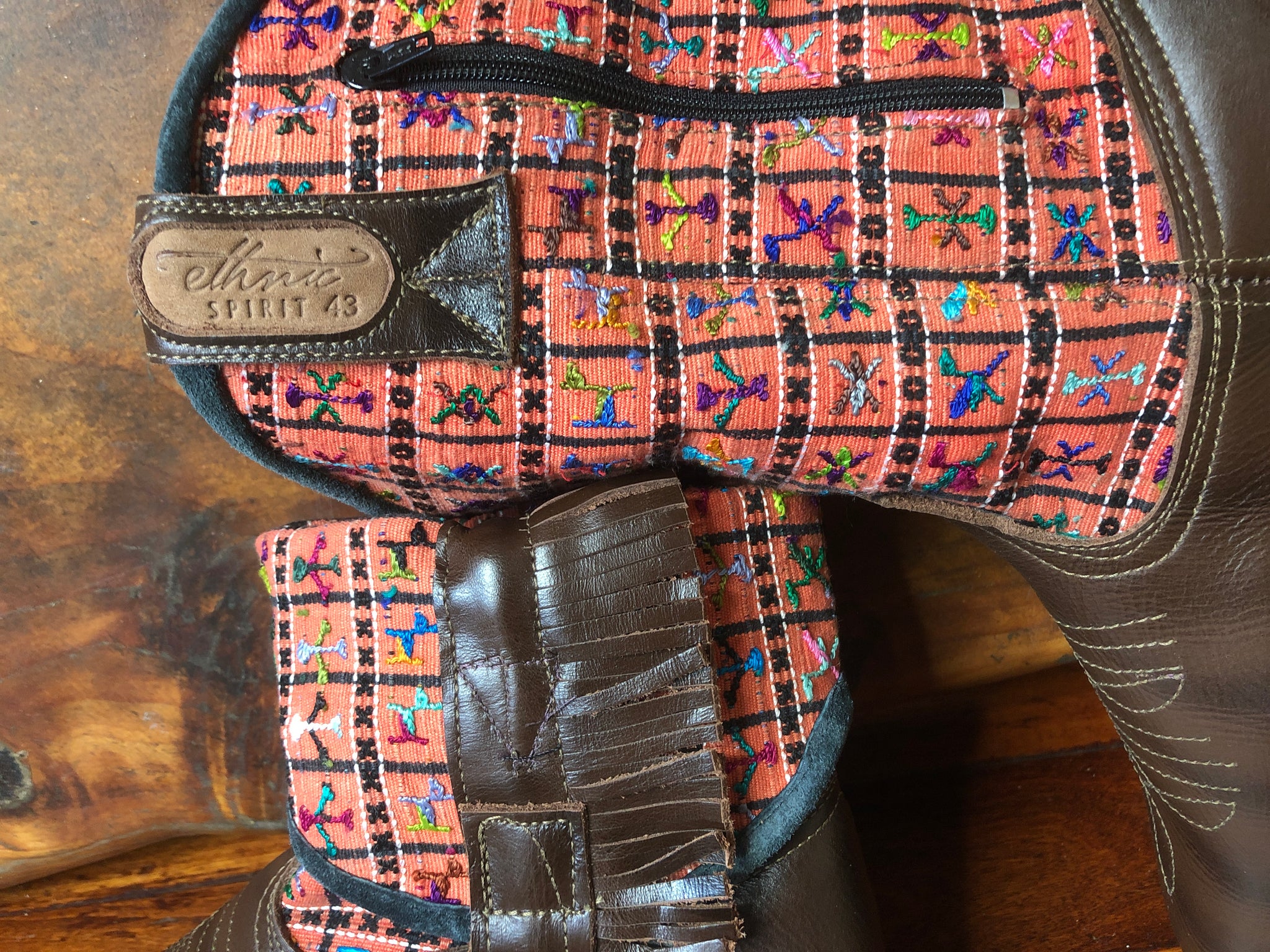 Antique hand-embroidered blouses with Mayan symbology are recycled to create a "one of a kind" boot with a unique combination of external and internal fabric, an internal zip for easy fitting and quality natural leather upper and tassels.