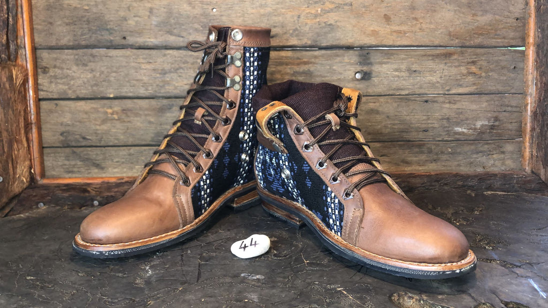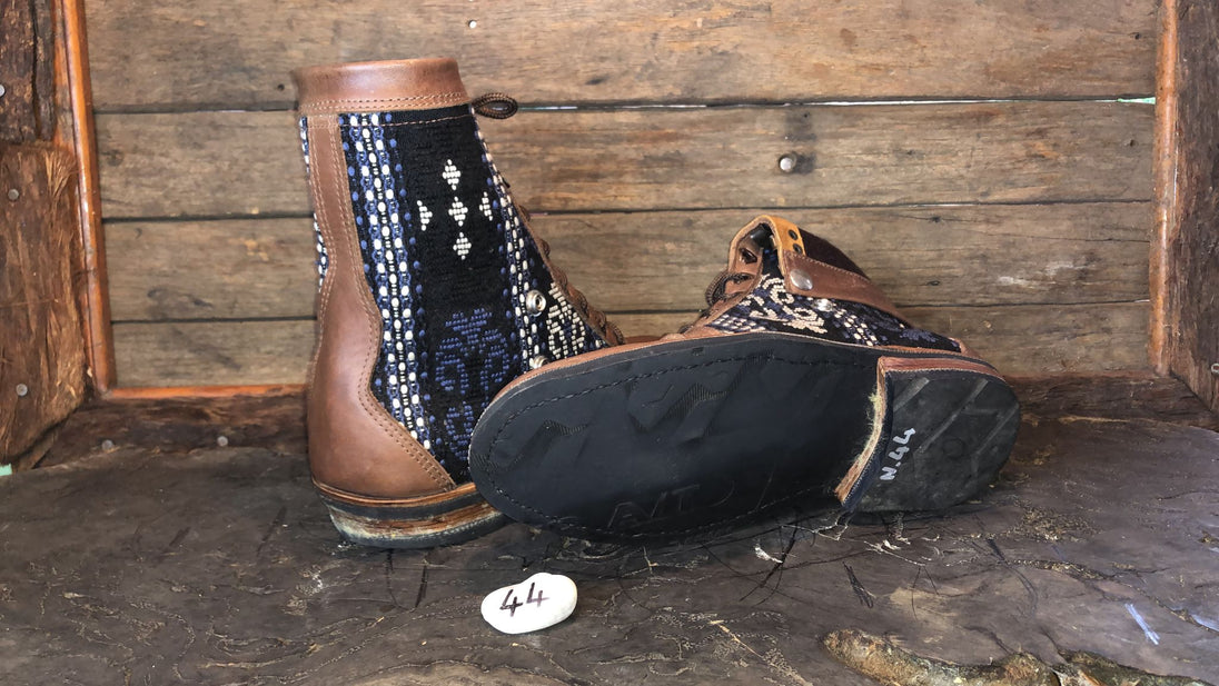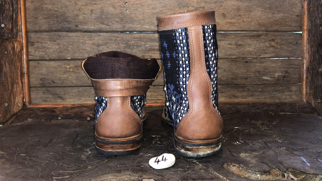Antique hand-embroidered blouses with Mayan symbology are recycled to create a one-of-a-kind boot with a unique combination of external embroidered fabric and a thick, hand-woven cotton tongue.