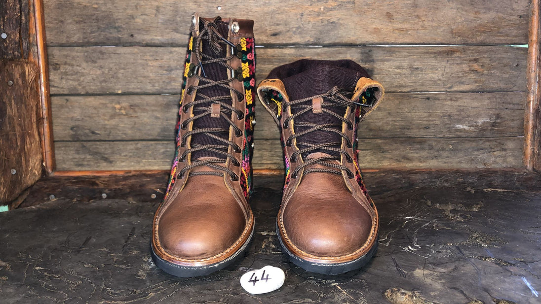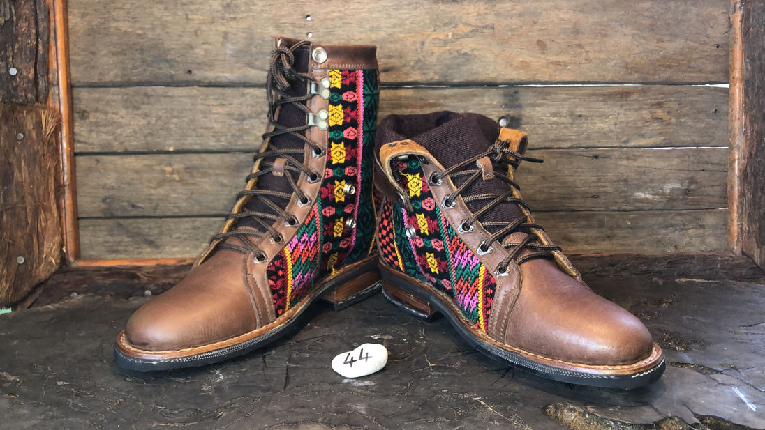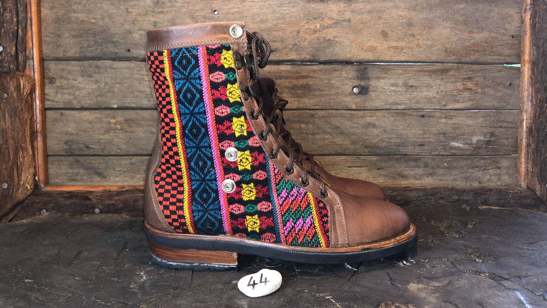 Antique hand-embroidered blouses with Mayan symbology are recycled to create a one-of-a-kind boot with a unique combination of external embroidered fabric and a thick, hand-woven cotton tongue.