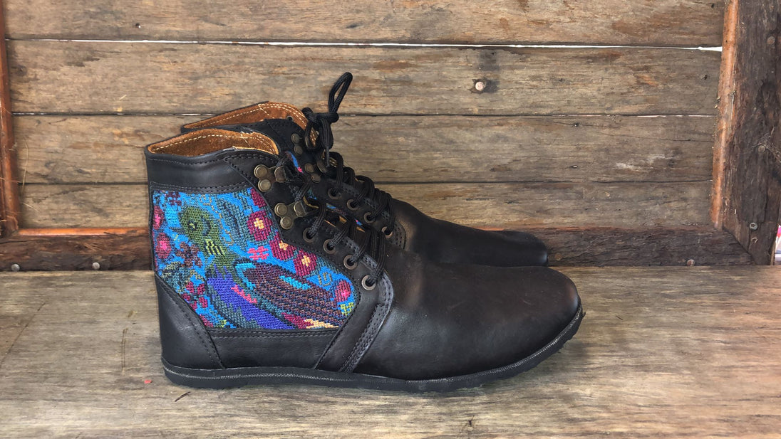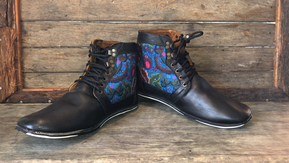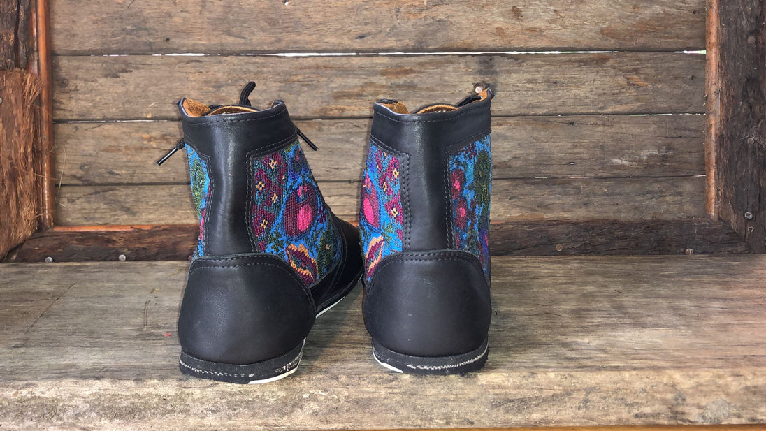 Antique hand-embroidered blouses with Mayan symbology are recycled and integrated into the shoe to create a "one of a kind" boot with its own unique combination of embroidered fabric.