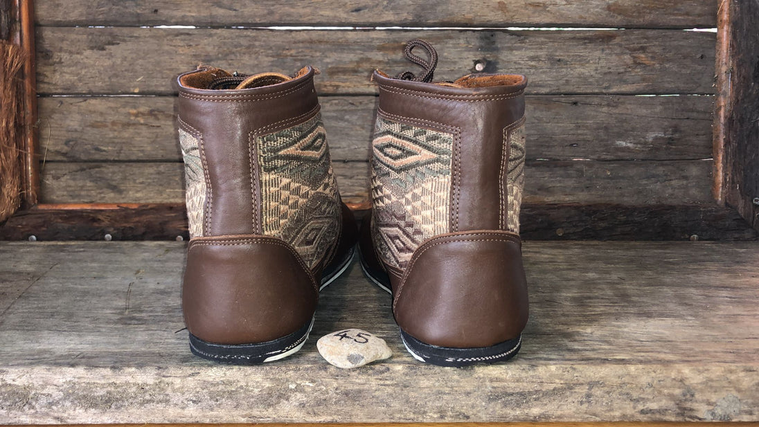Antique hand-embroidered blouses with Mayan symbology are recycled and integrated into the shoe to create a "one of a kind" boot with its own unique combination of embroidered fabric.